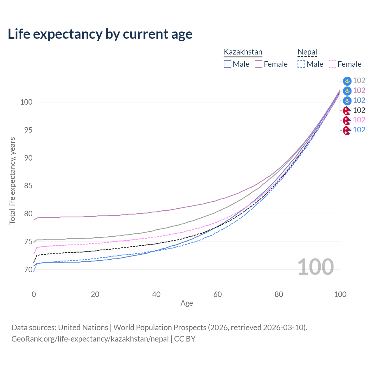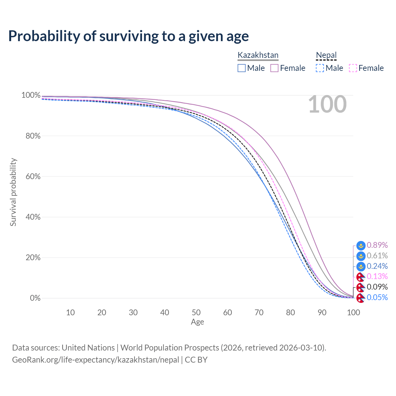 This life expectancy calculator shows the odds of living to 100, 95, 90, and below based on current age for both males and females in Kazakhstan and Nepal, along with mean and median age of death. The calculations are based on the 2026 life tables (actuarial tables) from the UN World Population Prospects.