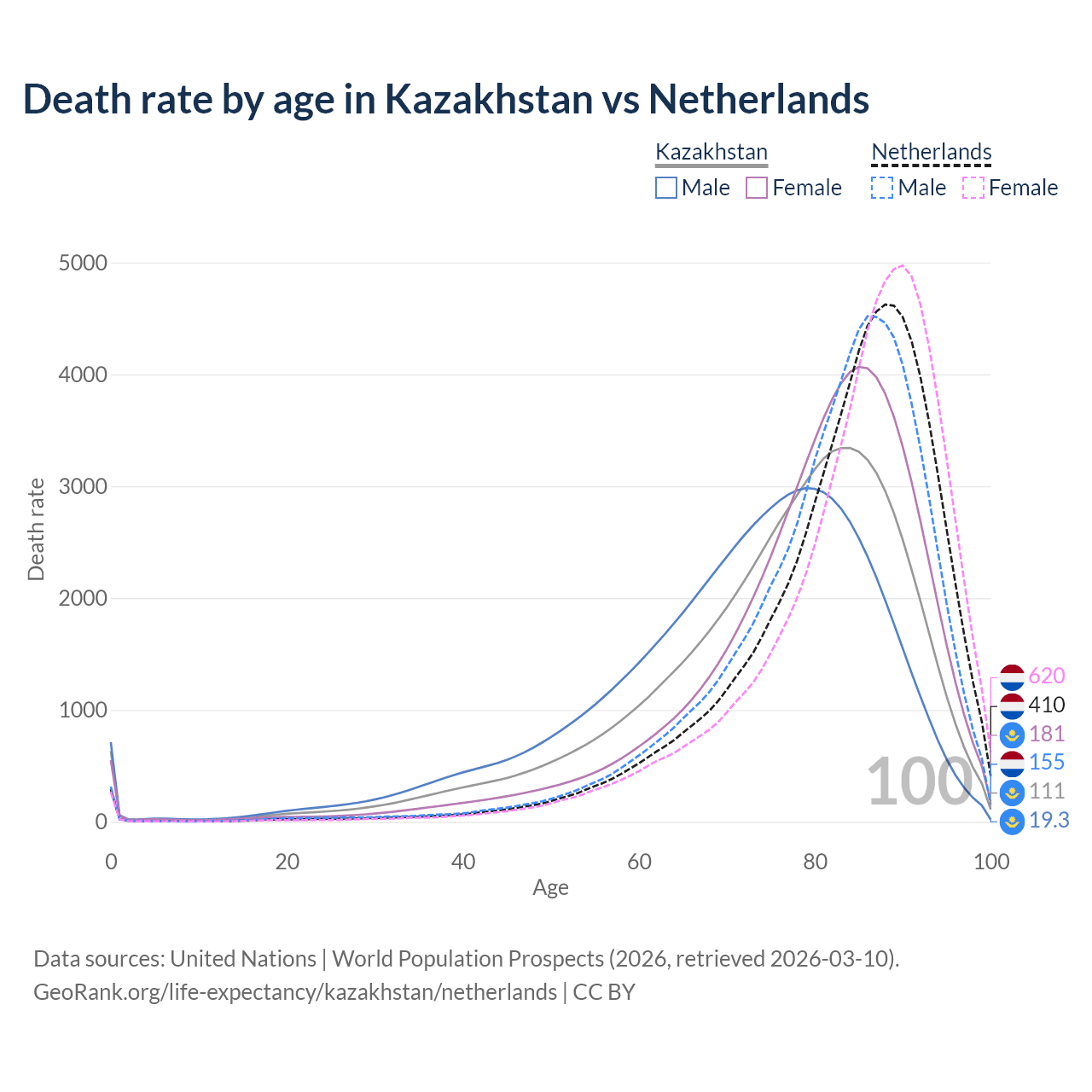 In Kazakhstan, the most common age of death is 84, compared to 88 in the Netherlands. The median age of death is 78.6 in Kazakhstan and 85.5 in the Netherlands, meaning only half of each cohort is expected to live past that age.