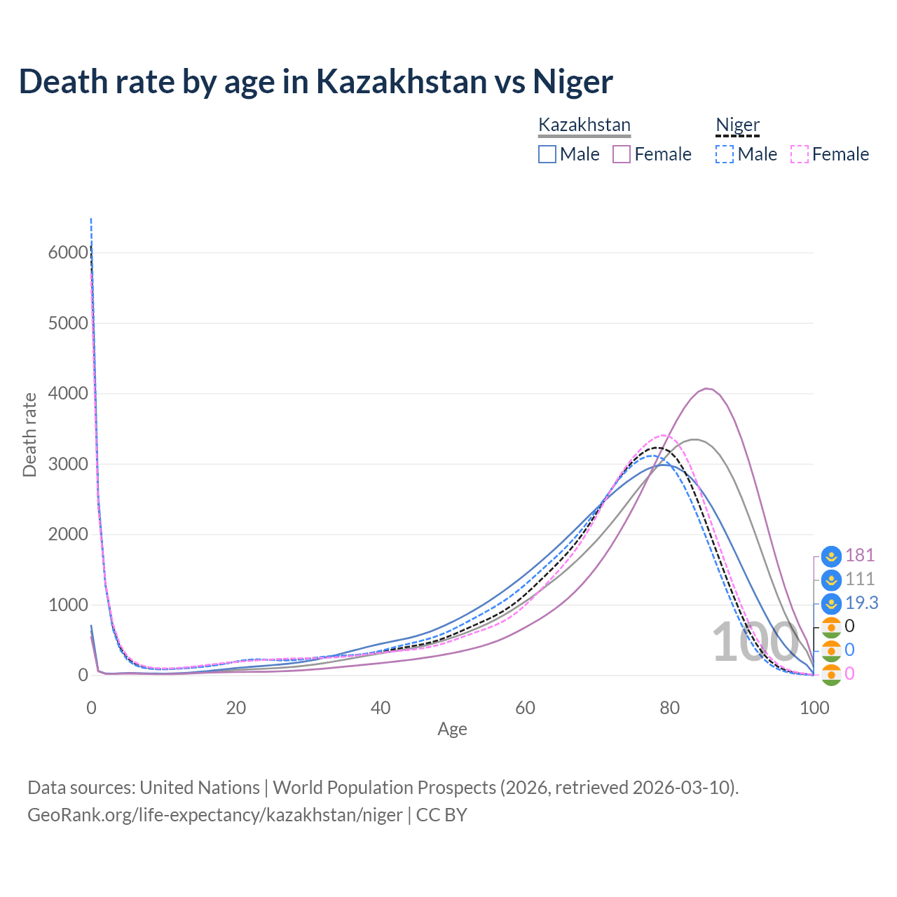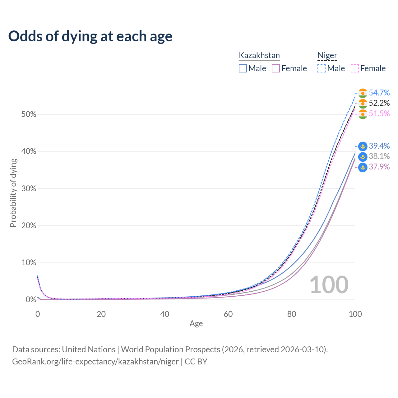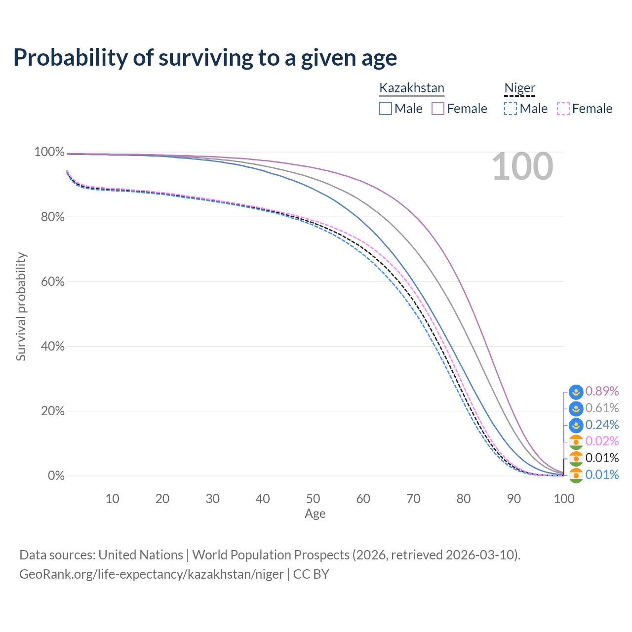 This life expectancy calculator shows the odds of living to 100, 95, 90, and below based on current age for both males and females in Kazakhstan and Niger, along with mean and median age of death. The calculations are based on the 2026 life tables (actuarial tables) from the UN World Population Prospects.