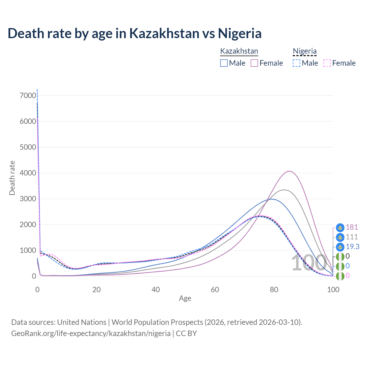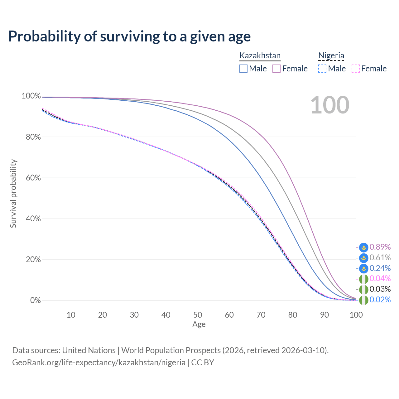 This life expectancy calculator shows the odds of living to 100, 95, 90, and below based on current age for both males and females in Kazakhstan and Nigeria, along with mean and median age of death. The calculations are based on the 2026 life tables (actuarial tables) from the UN World Population Prospects.