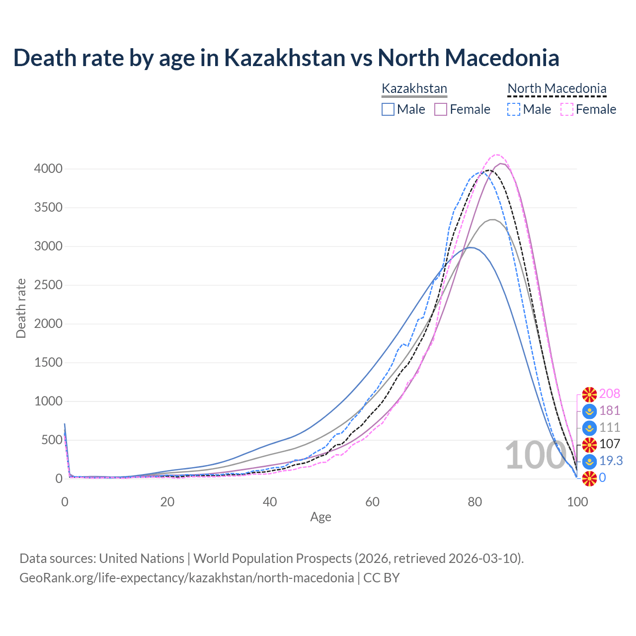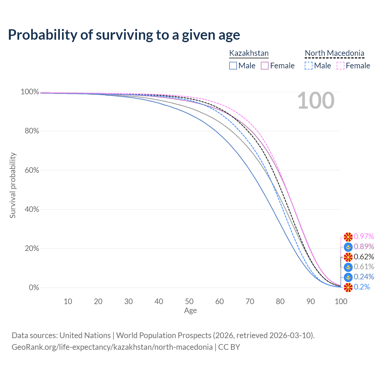 This life expectancy calculator shows the odds of living to 100, 95, 90, and below based on current age for both males and females in Kazakhstan and North Macedonia, along with mean and median age of death. The calculations are based on the 2026 life tables (actuarial tables) from the UN World Population Prospects.