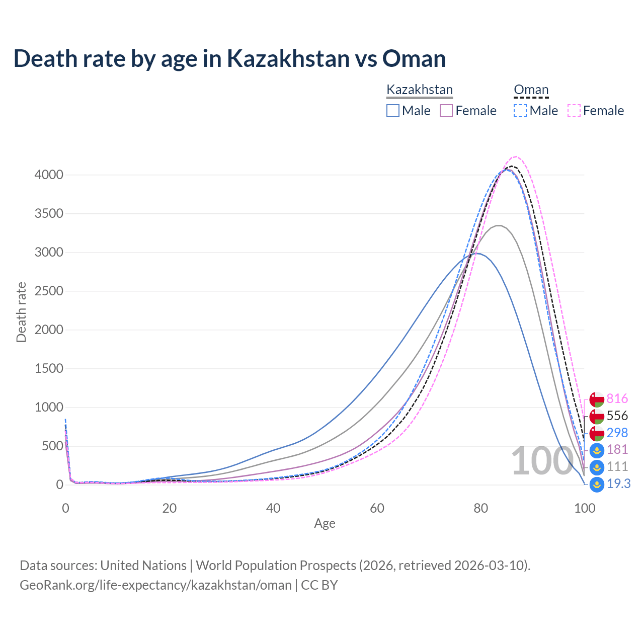 This life expectancy calculator shows the odds of living to 100, 95, 90, and below based on current age for both males and females in Kazakhstan and Oman, along with mean and median age of death. The calculations are based on the 2026 life tables (actuarial tables) from the UN World Population Prospects.