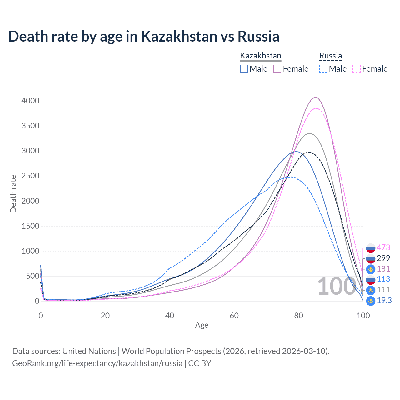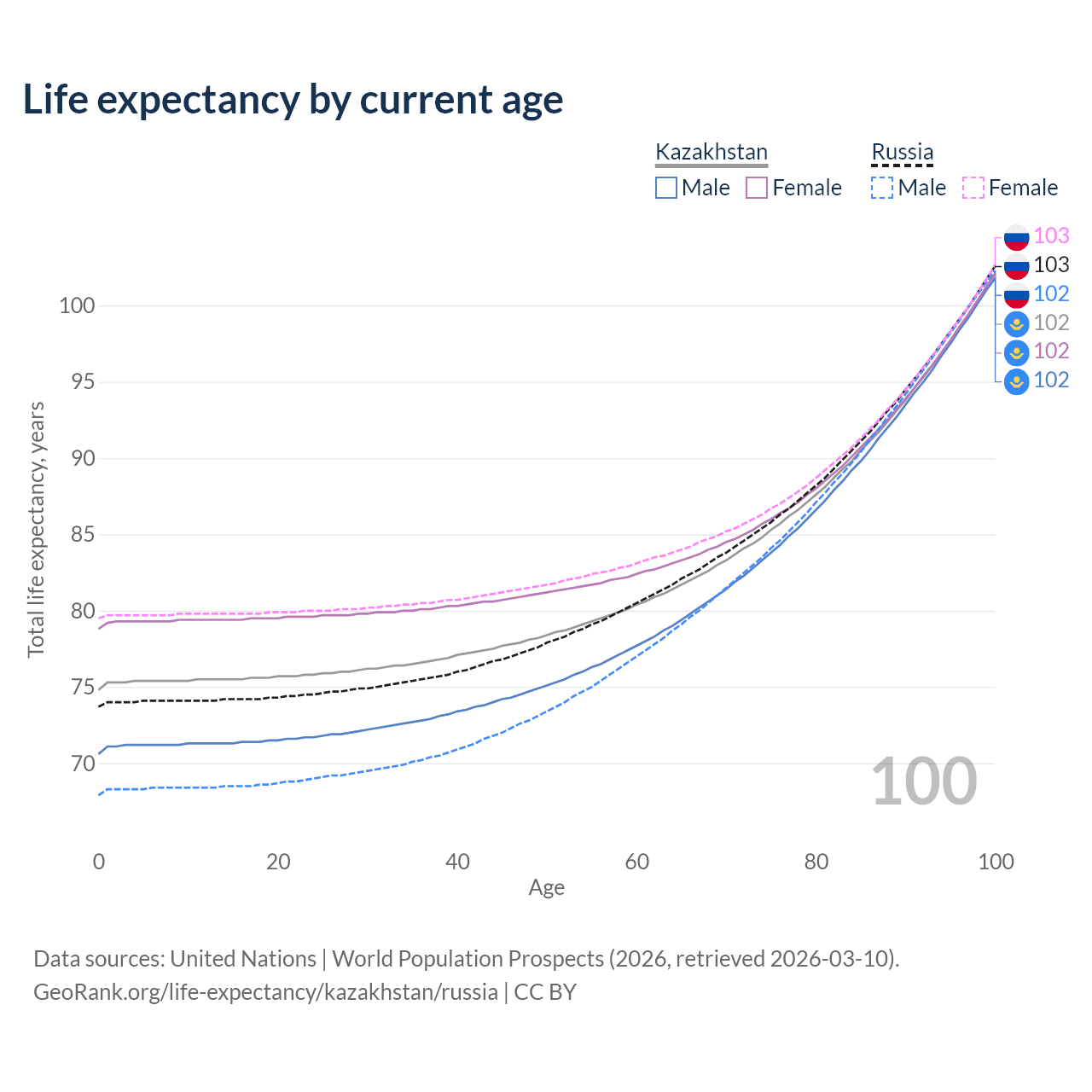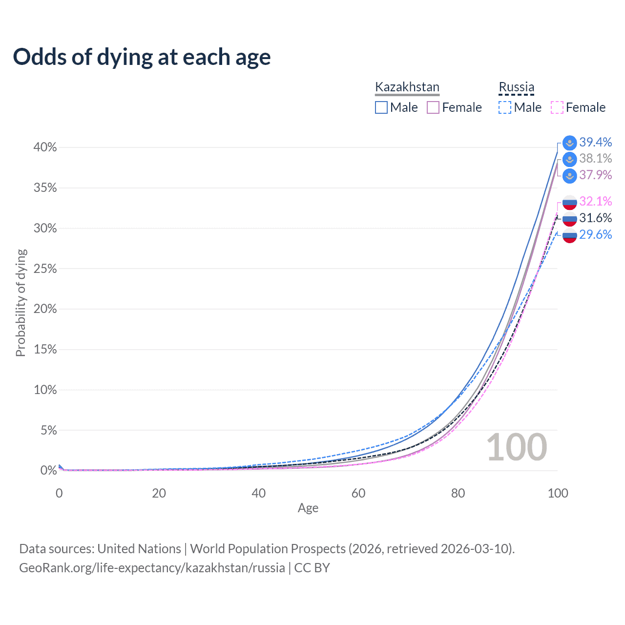 This life expectancy calculator shows the odds of living to 100, 95, 90, and below based on current age for both males and females in Kazakhstan and Russia, along with mean and median age of death. The calculations are based on the 2026 life tables (actuarial tables) from the UN World Population Prospects.