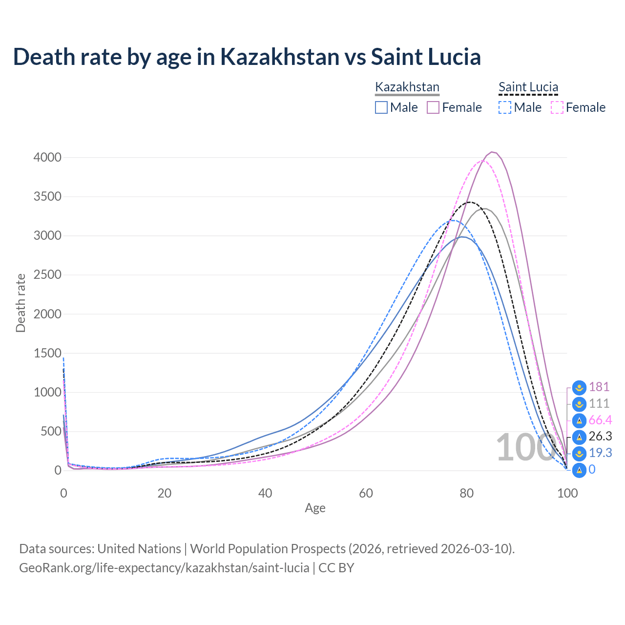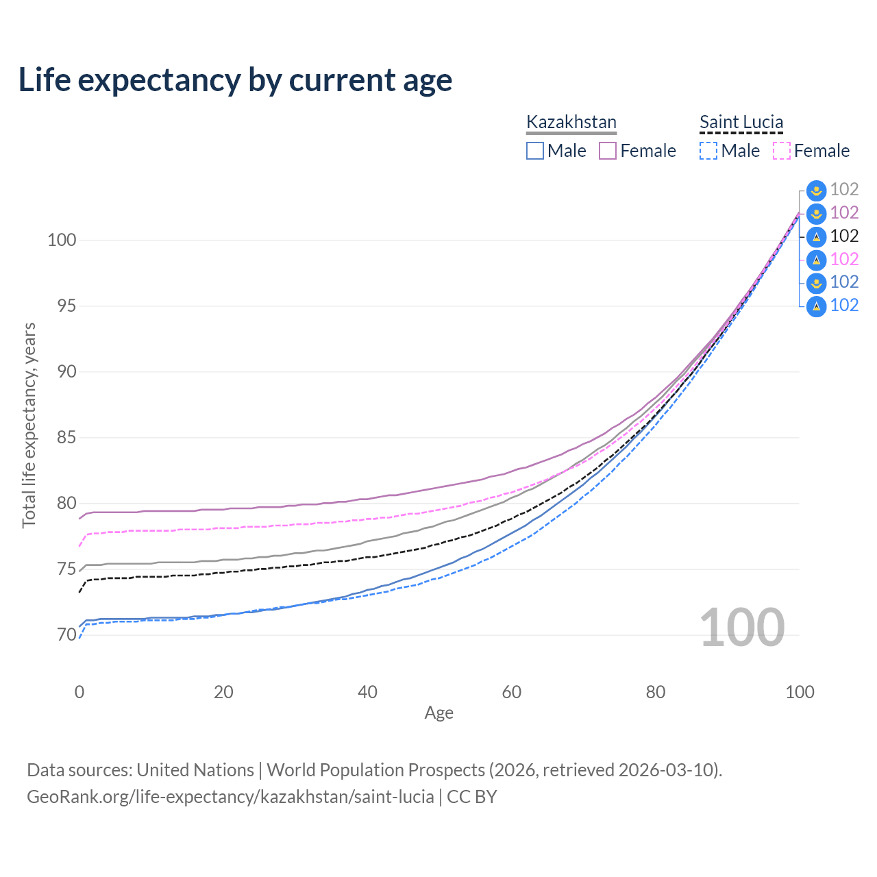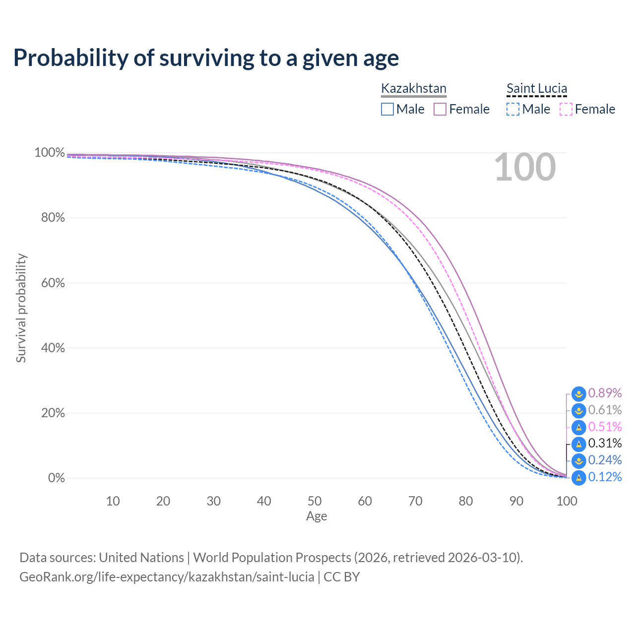 This life expectancy calculator shows the odds of living to 100, 95, 90, and below based on current age for both males and females in Kazakhstan and Saint Lucia, along with mean and median age of death. The calculations are based on the 2026 life tables (actuarial tables) from the UN World Population Prospects.