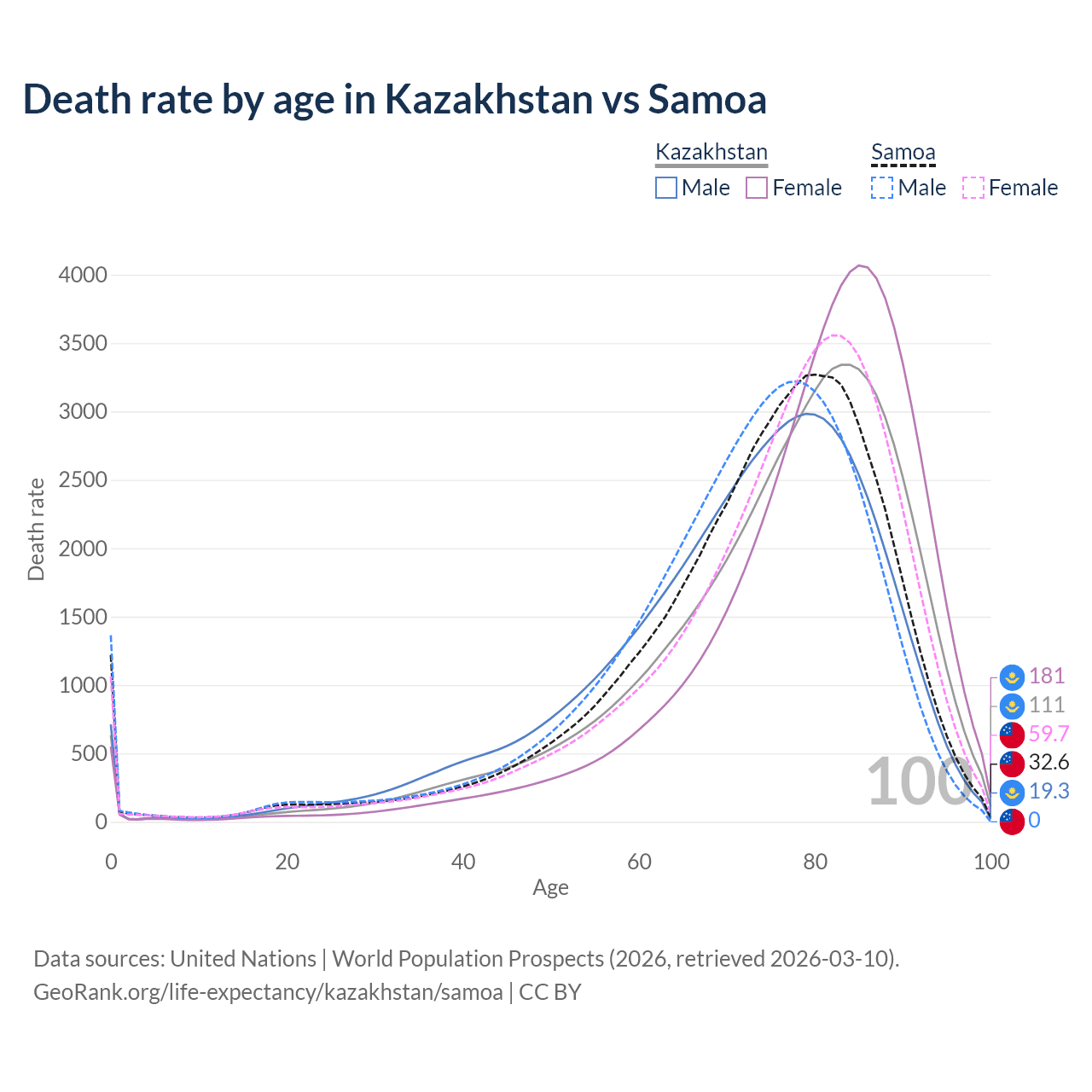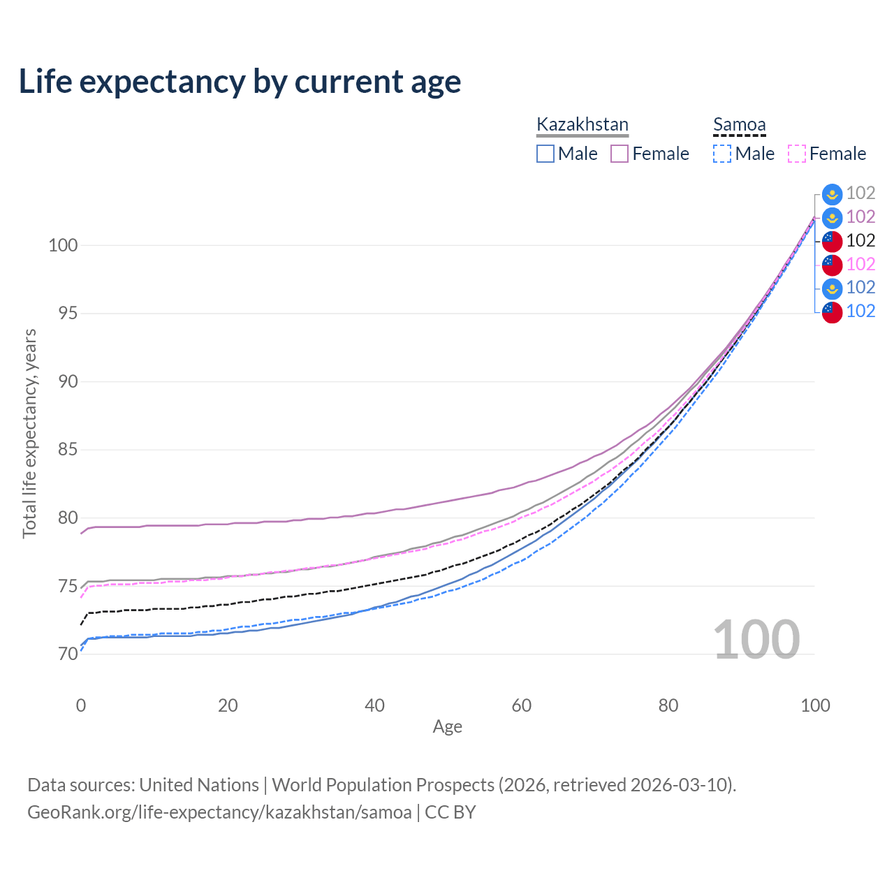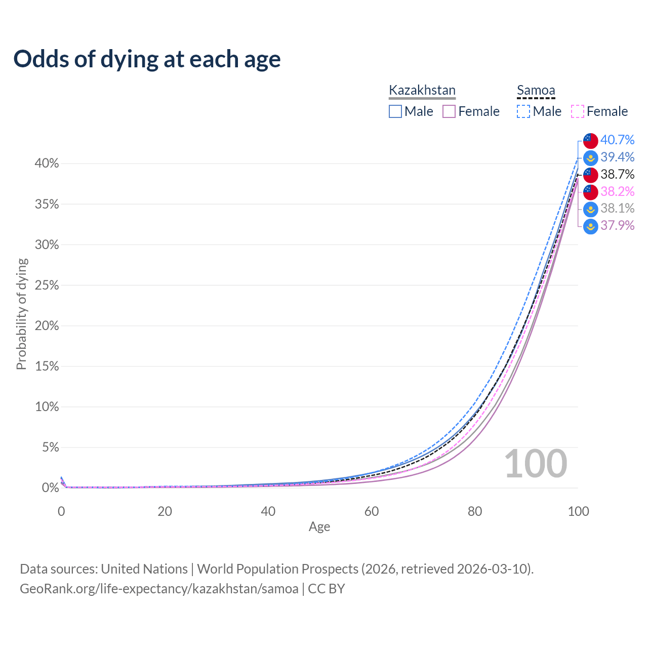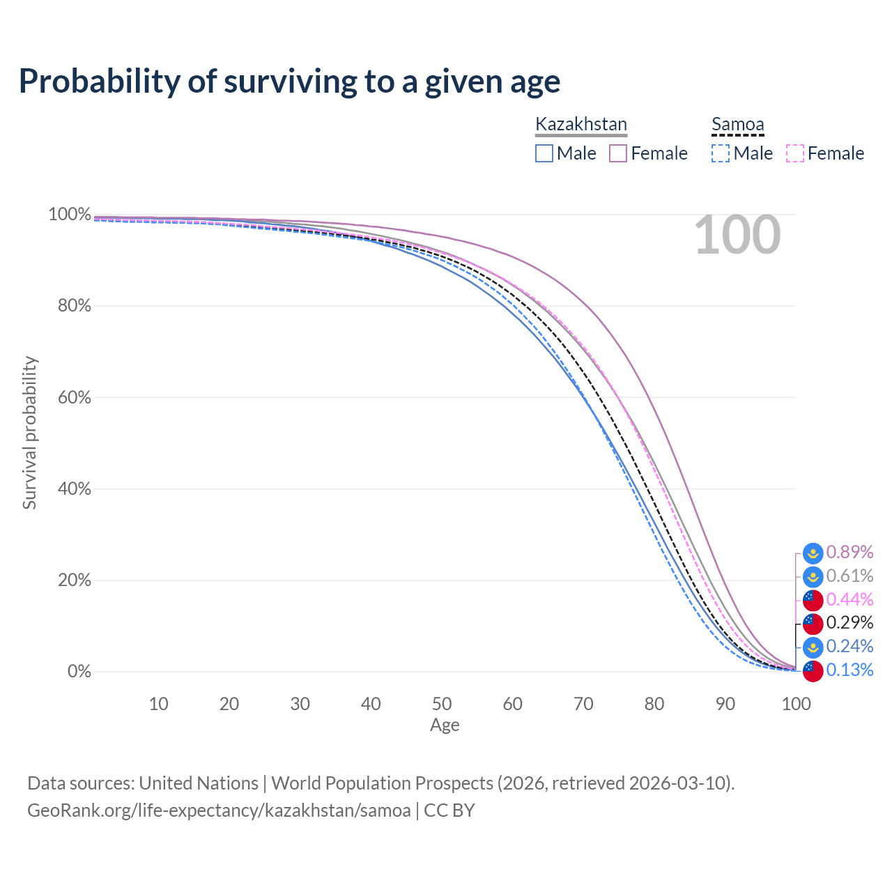 This life expectancy calculator shows the odds of living to 100, 95, 90, and below based on current age for both males and females in Kazakhstan and Samoa, along with mean and median age of death. The calculations are based on the 2026 life tables (actuarial tables) from the UN World Population Prospects.