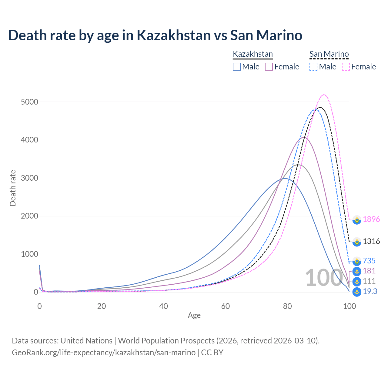 In Kazakhstan, the most common age of death is 84, compared to 91 in San Marino. The median age of death is 78.6 in Kazakhstan and 88.3 in San Marino, meaning only half of each cohort is expected to live past that age.