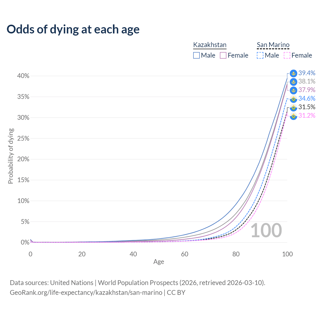 This life expectancy calculator shows the odds of living to 100, 95, 90, and below based on current age for both males and females in Kazakhstan and San Marino, along with mean and median age of death. The calculations are based on the 2026 life tables (actuarial tables) from the UN World Population Prospects.