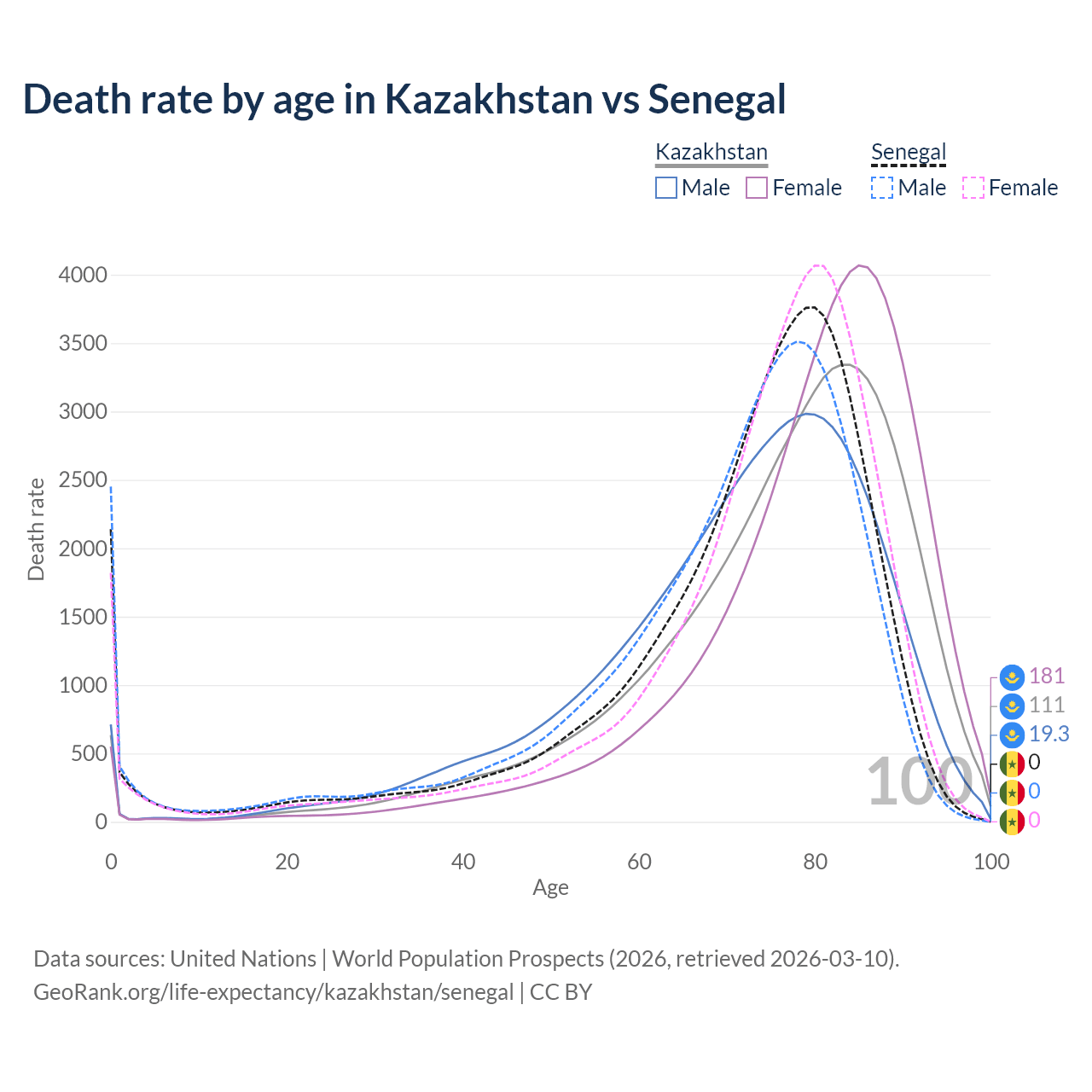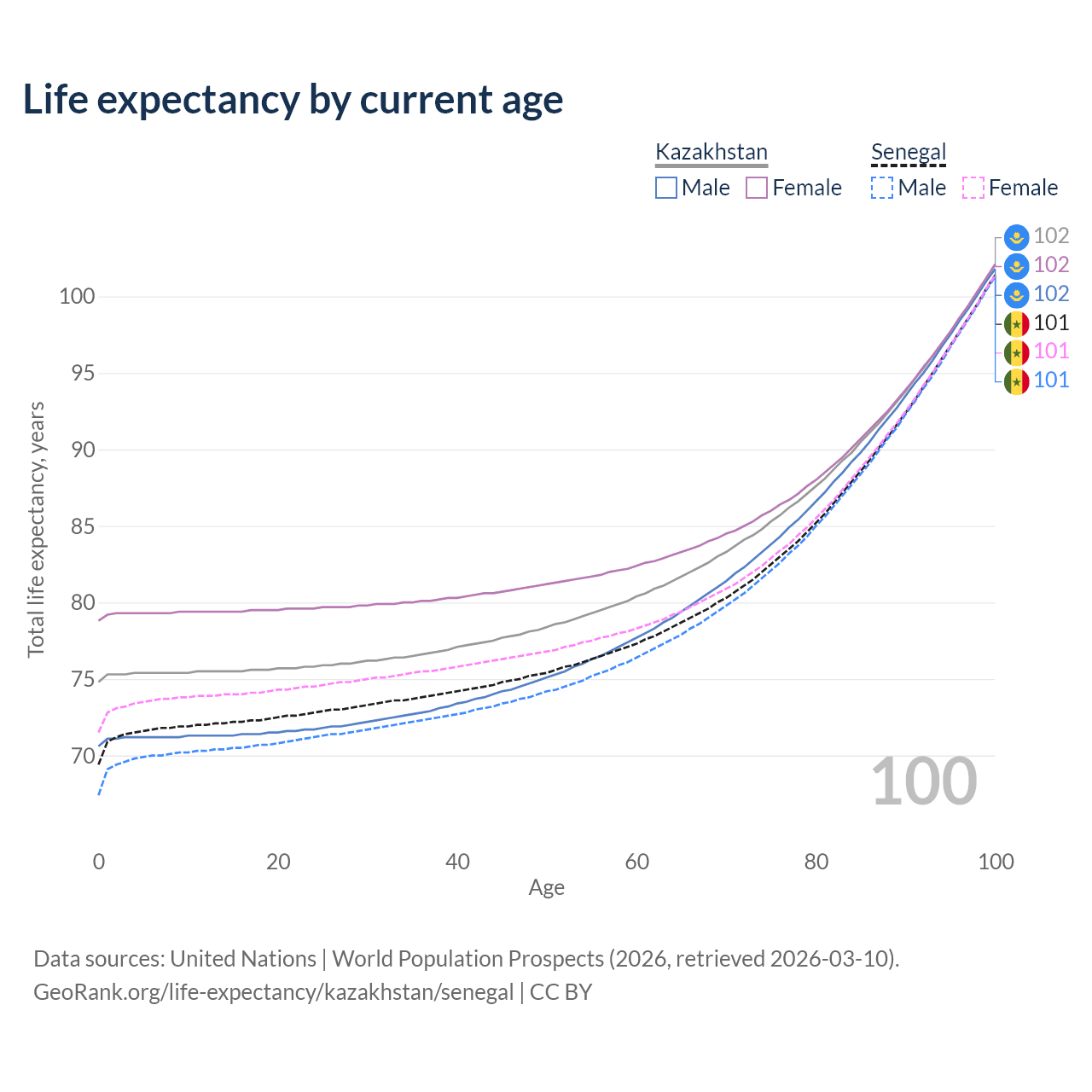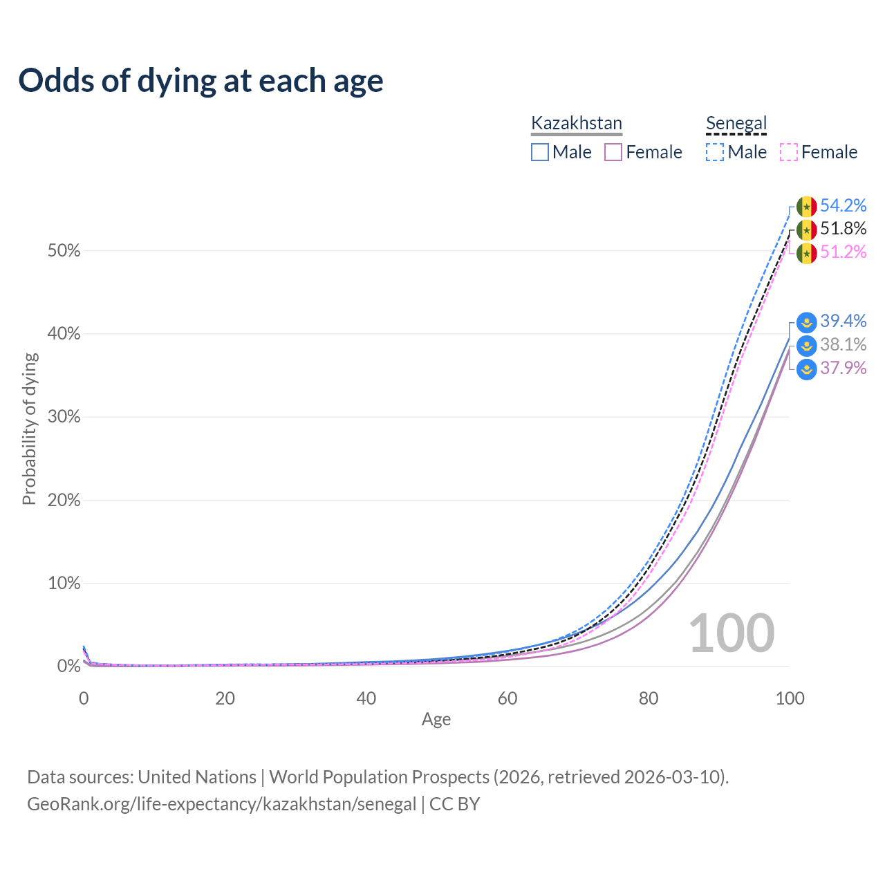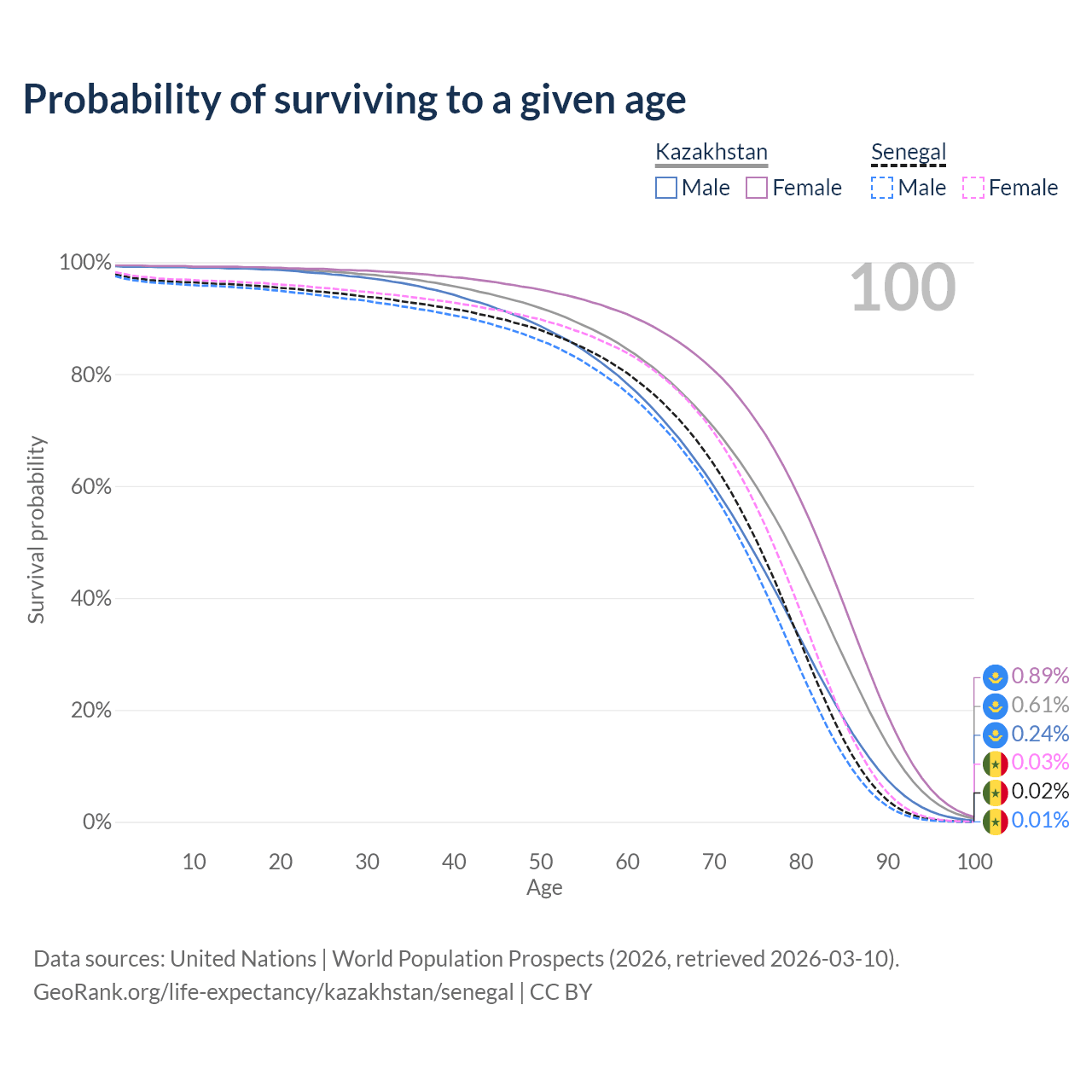 This life expectancy calculator shows the odds of living to 100, 95, 90, and below based on current age for both males and females in Kazakhstan and Senegal, along with mean and median age of death. The calculations are based on the 2026 life tables (actuarial tables) from the UN World Population Prospects.