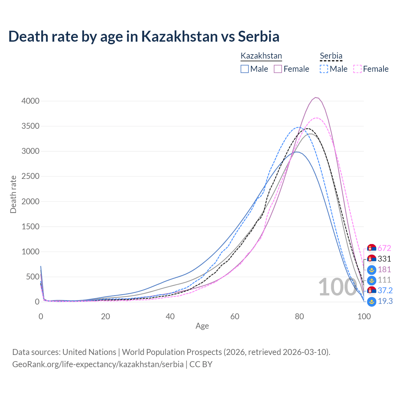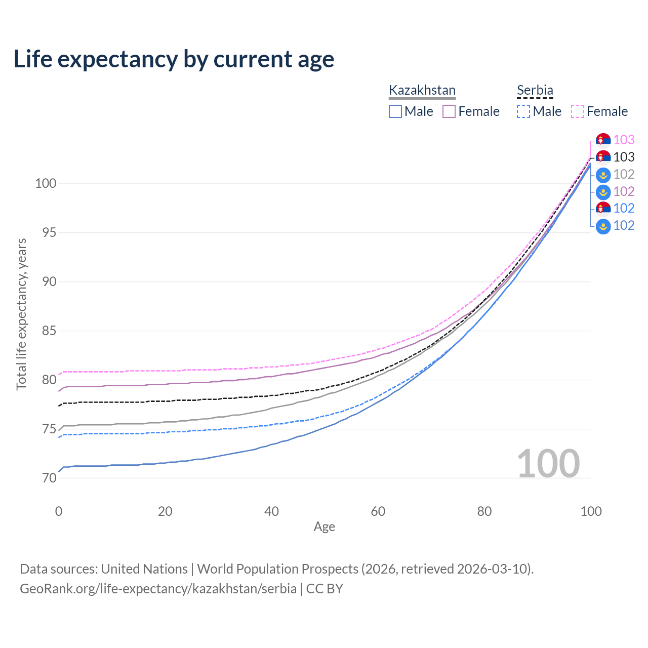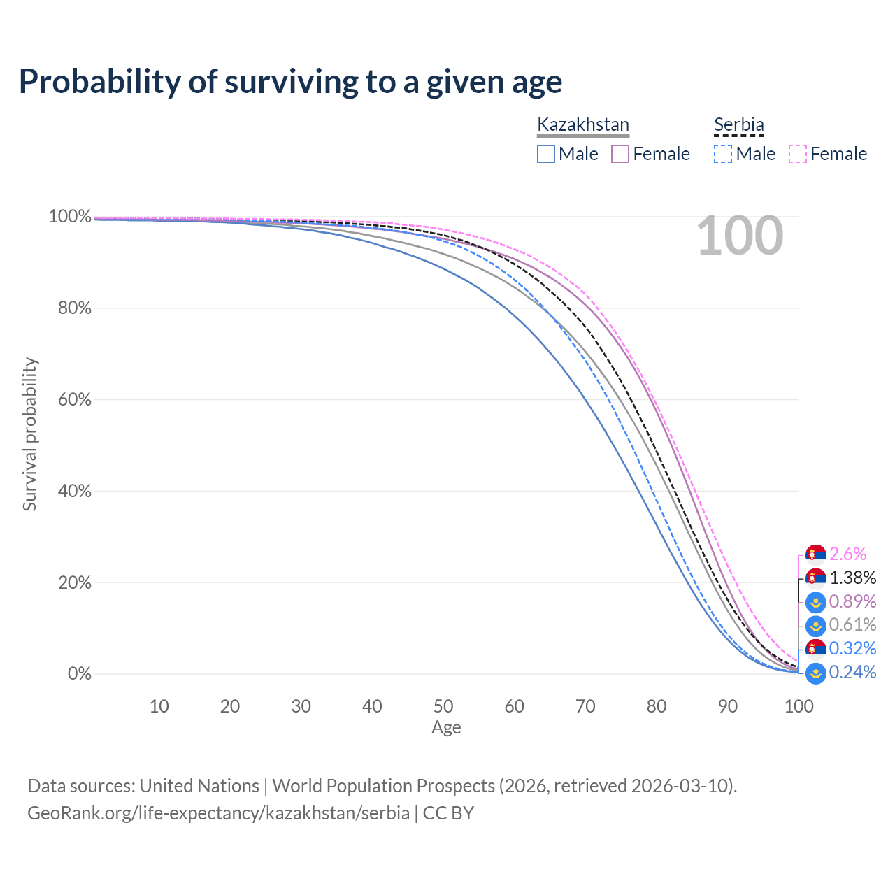 This life expectancy calculator shows the odds of living to 100, 95, 90, and below based on current age for both males and females in Kazakhstan and Serbia, along with mean and median age of death. The calculations are based on the 2026 life tables (actuarial tables) from the UN World Population Prospects.