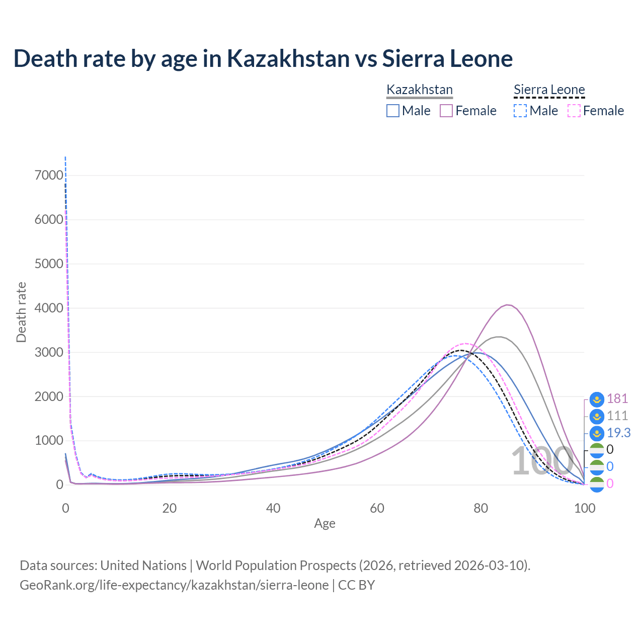 In Kazakhstan, the most common age of death is 84, compared to 0 in Sierra Leone. The median age of death is 78.6 in Kazakhstan and 70.8 in Sierra Leone, meaning only half of each cohort is expected to live past that age.