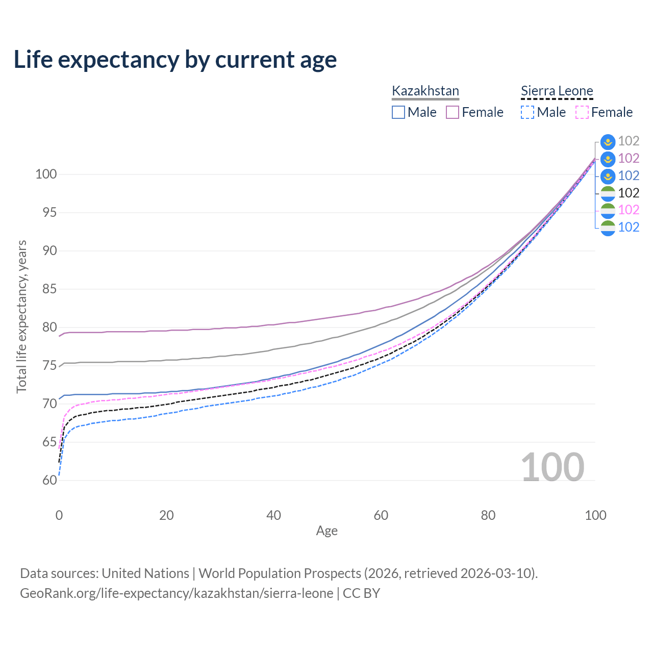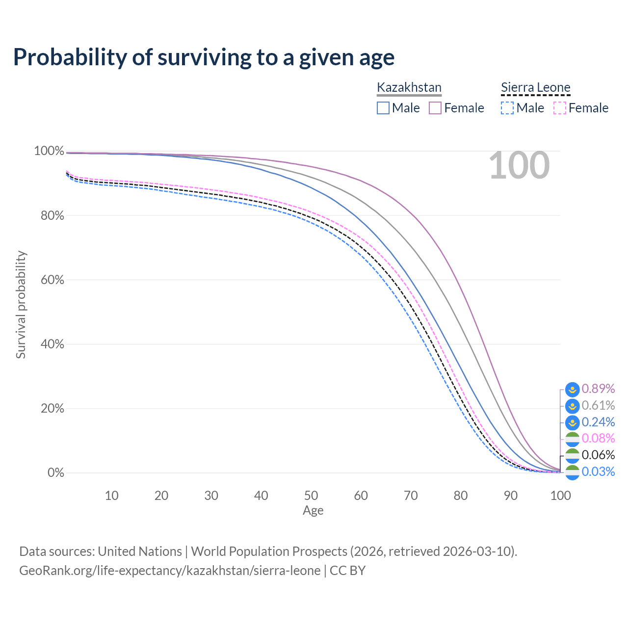 This life expectancy calculator shows the odds of living to 100, 95, 90, and below based on current age for both males and females in Kazakhstan and Sierra Leone, along with mean and median age of death. The calculations are based on the 2026 life tables (actuarial tables) from the UN World Population Prospects.