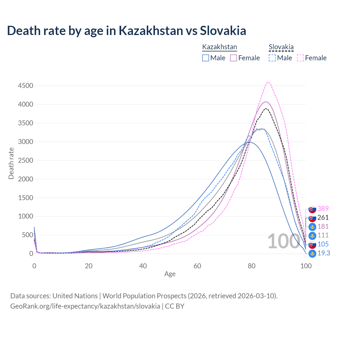 In Kazakhstan, the most common age of death is 84, compared to 85 in Slovakia. The median age of death is 78.6 in Kazakhstan and 82 in Slovakia, meaning only half of each cohort is expected to live past that age.