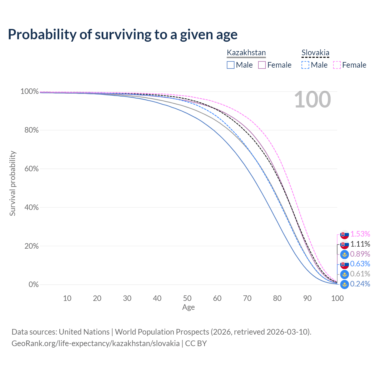 This life expectancy calculator shows the odds of living to 100, 95, 90, and below based on current age for both males and females in Kazakhstan and Slovakia, along with mean and median age of death. The calculations are based on the 2026 life tables (actuarial tables) from the UN World Population Prospects.