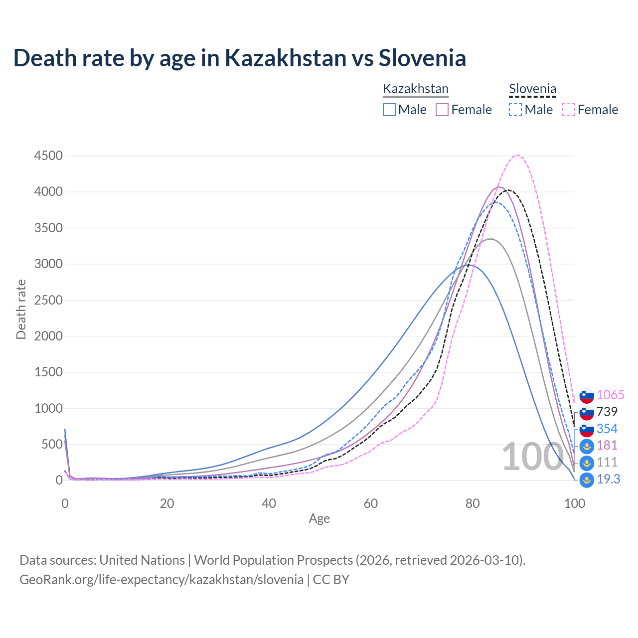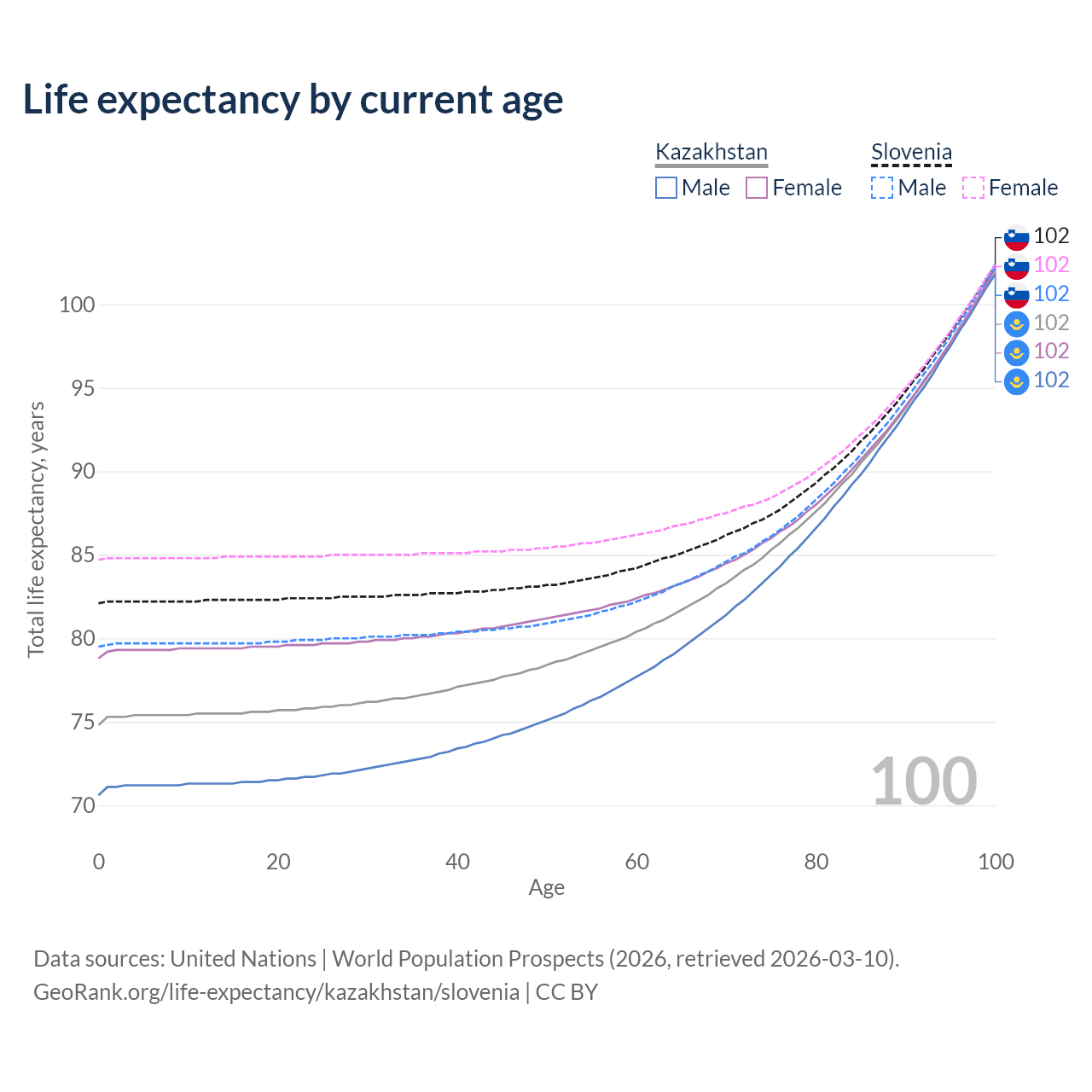 This life expectancy calculator shows the odds of living to 100, 95, 90, and below based on current age for both males and females in Kazakhstan and Slovenia, along with mean and median age of death. The calculations are based on the 2026 life tables (actuarial tables) from the UN World Population Prospects.