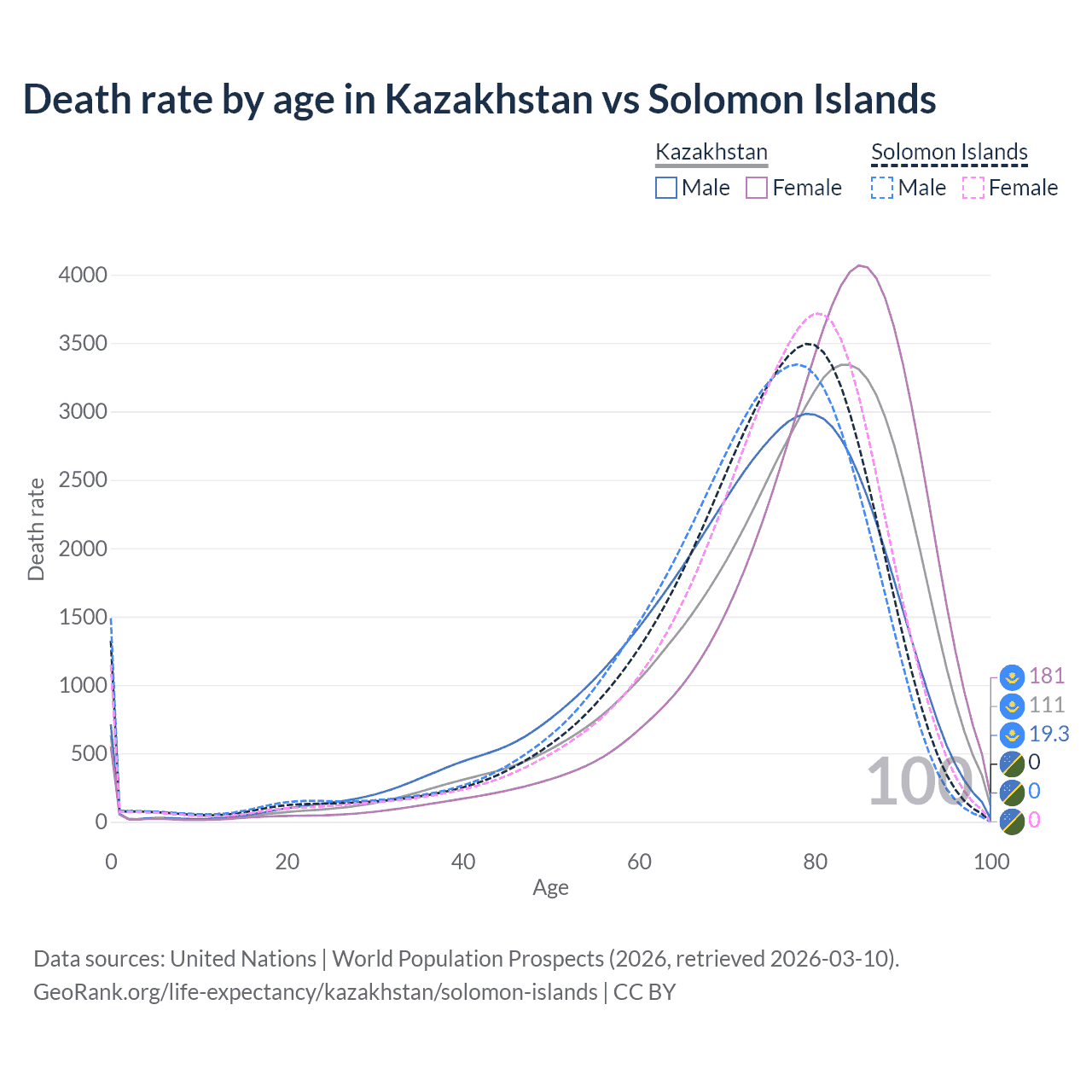 In Kazakhstan, the most common age of death is 84, compared to 79 in the Solomon Islands. The median age of death is 78.6 in Kazakhstan and 74.9 in the Solomon Islands, meaning only half of each cohort is expected to live past that age.