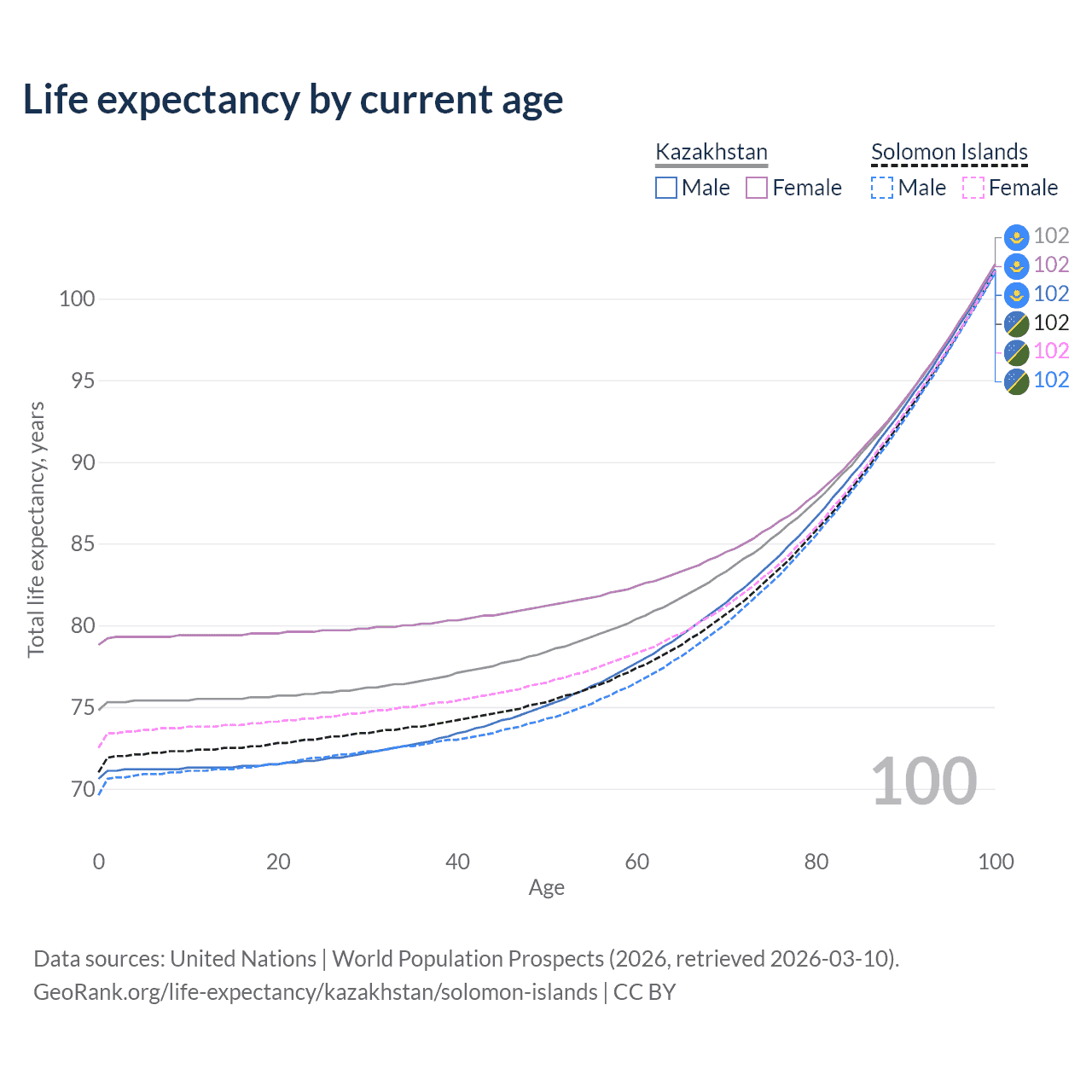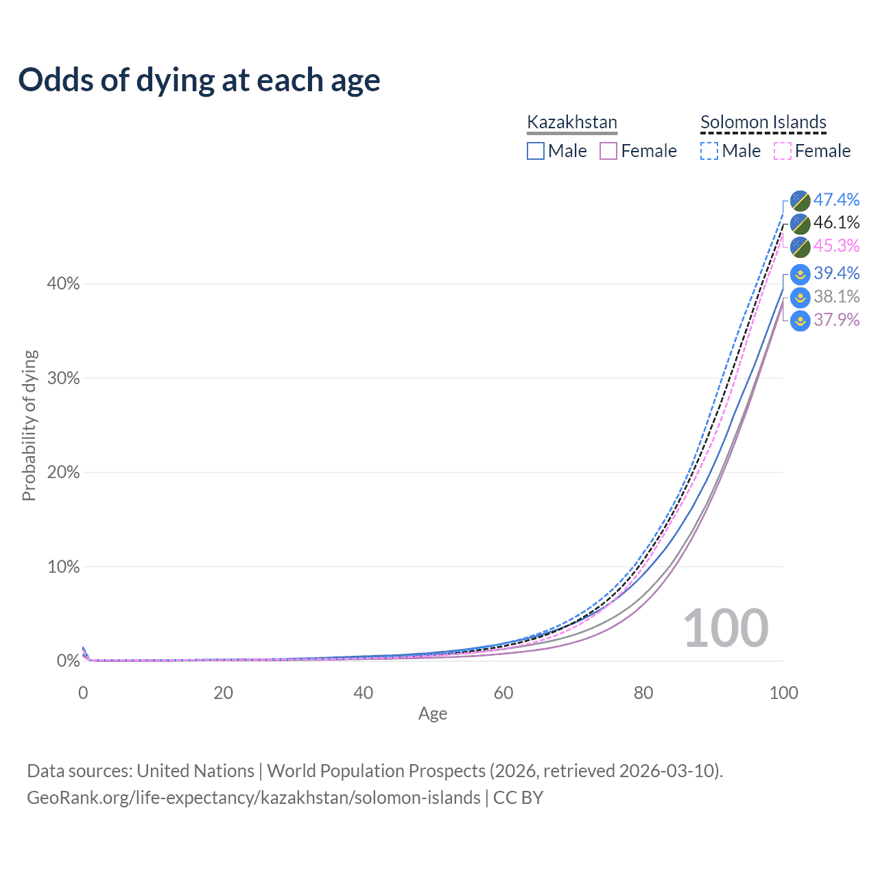 This life expectancy calculator shows the odds of living to 100, 95, 90, and below based on current age for both males and females in Kazakhstan and the Solomon Islands, along with mean and median age of death. The calculations are based on the 2026 life tables (actuarial tables) from the UN World Population Prospects.