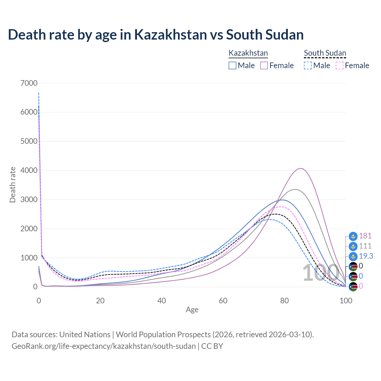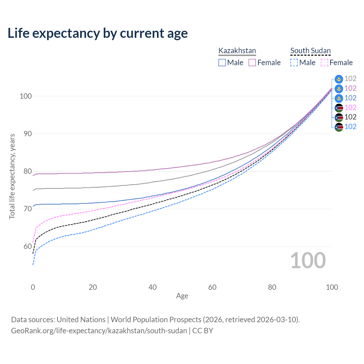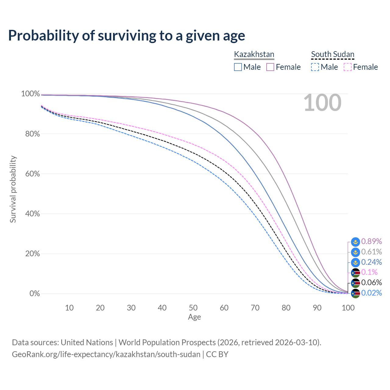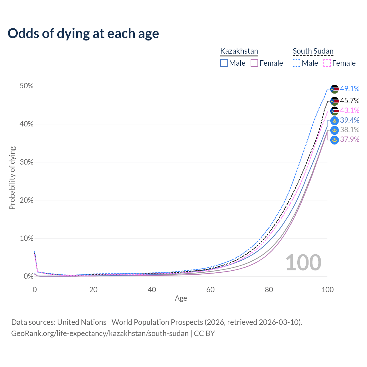 This life expectancy calculator shows the odds of living to 100, 95, 90, and below based on current age for both males and females in Kazakhstan and South Sudan, along with mean and median age of death. The calculations are based on the 2026 life tables (actuarial tables) from the UN World Population Prospects.