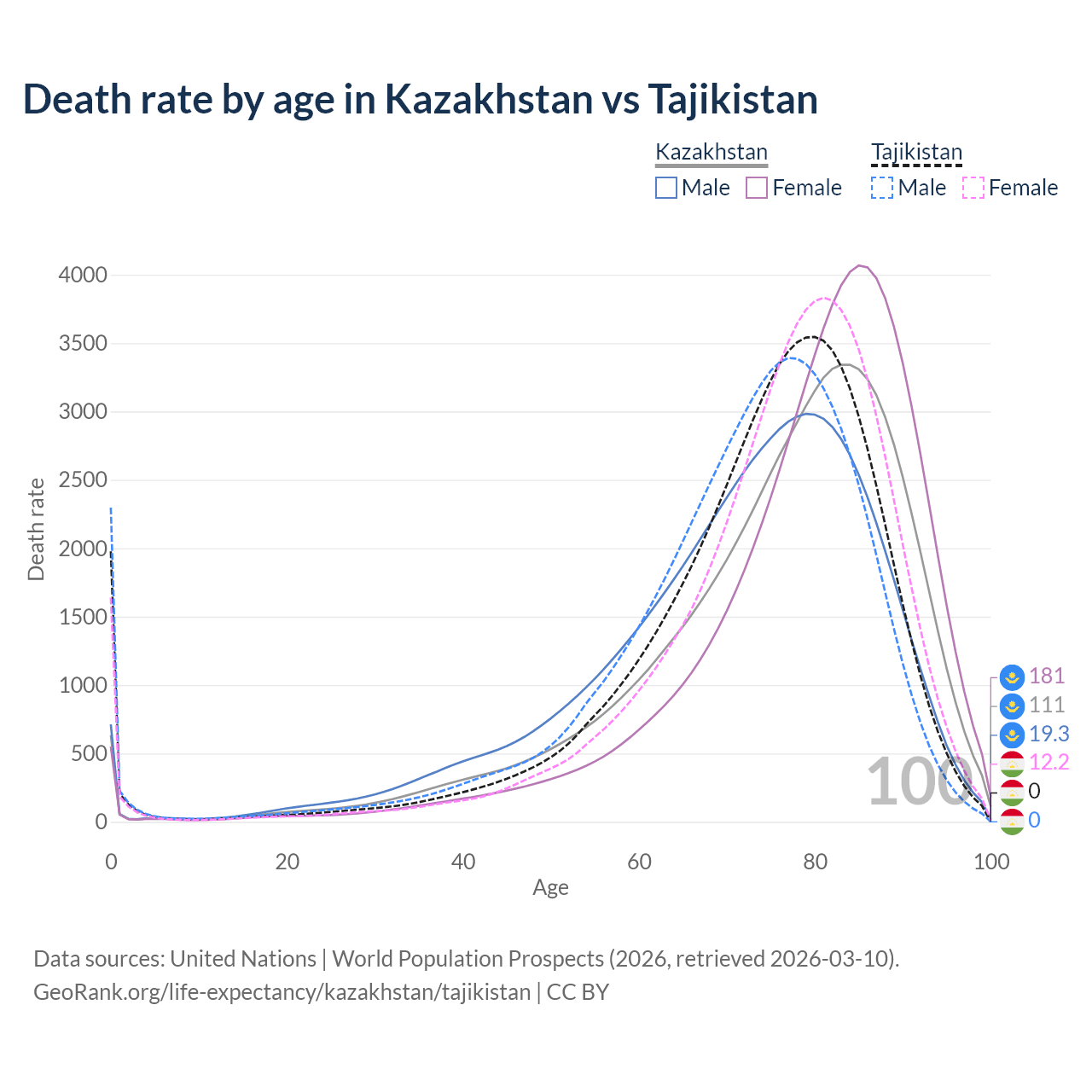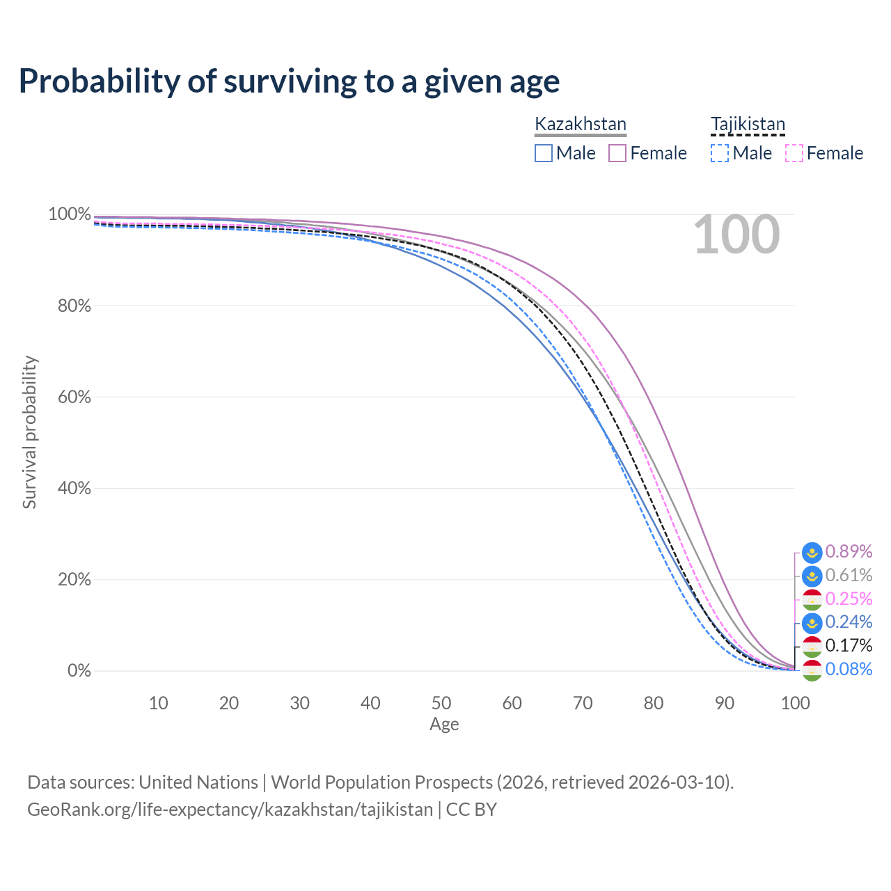 This life expectancy calculator shows the odds of living to 100, 95, 90, and below based on current age for both males and females in Kazakhstan and Tajikistan, along with mean and median age of death. The calculations are based on the 2026 life tables (actuarial tables) from the UN World Population Prospects.