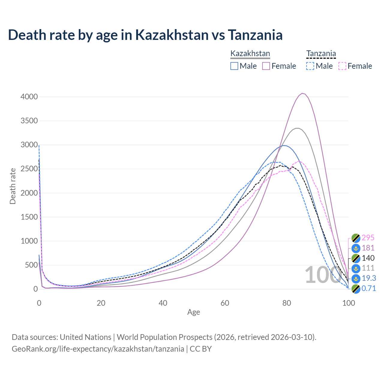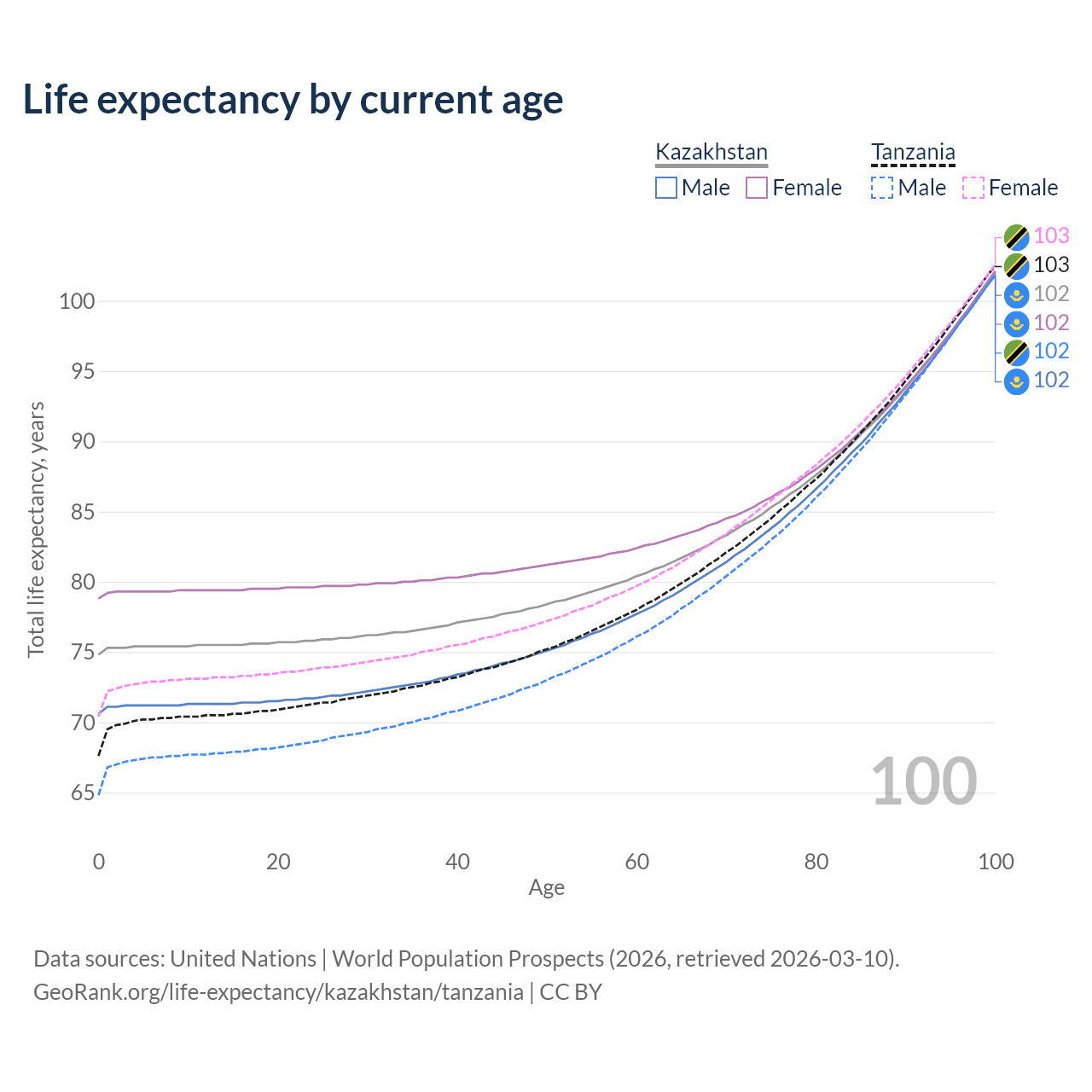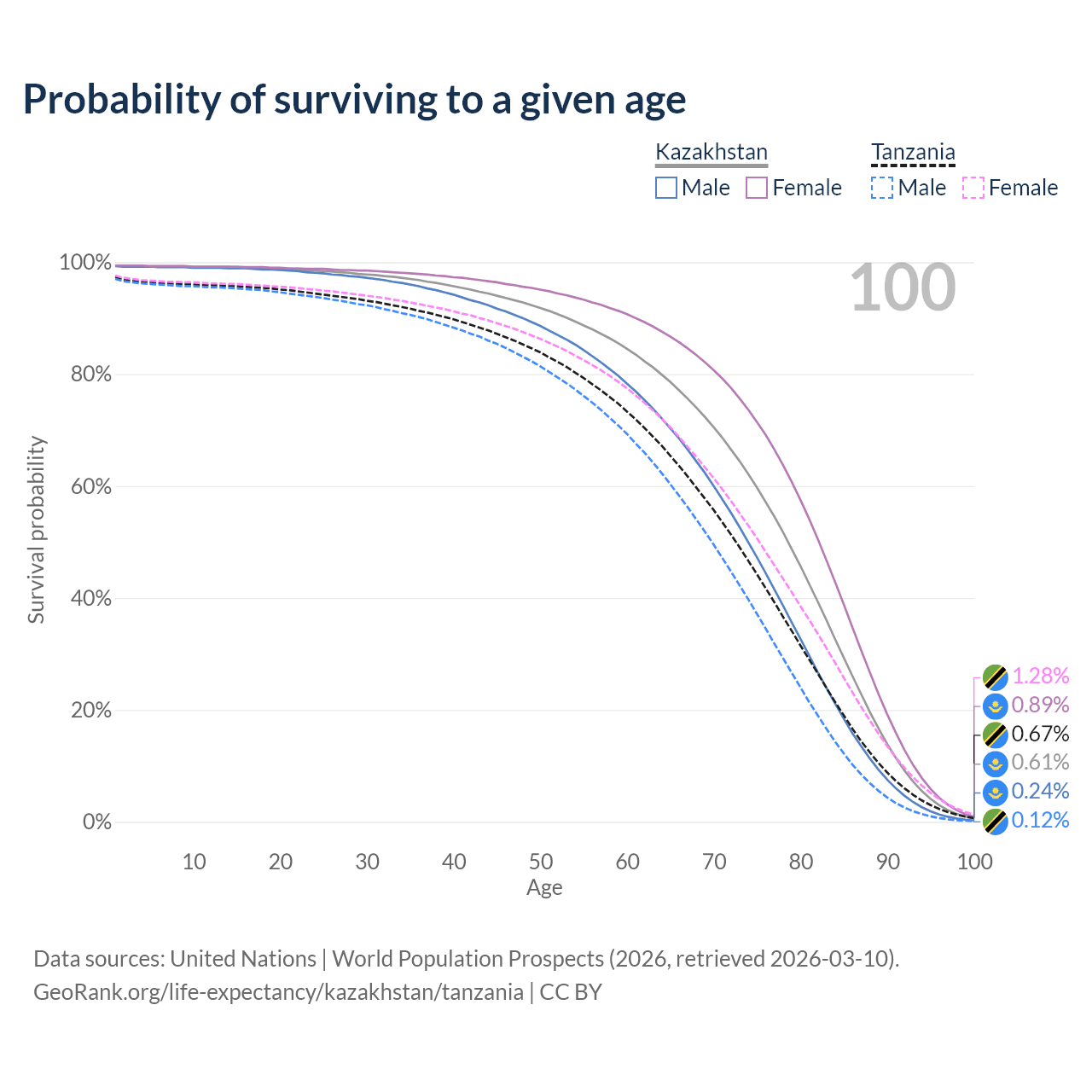 This life expectancy calculator shows the odds of living to 100, 95, 90, and below based on current age for both males and females in Kazakhstan and Tanzania, along with mean and median age of death. The calculations are based on the 2026 life tables (actuarial tables) from the UN World Population Prospects.