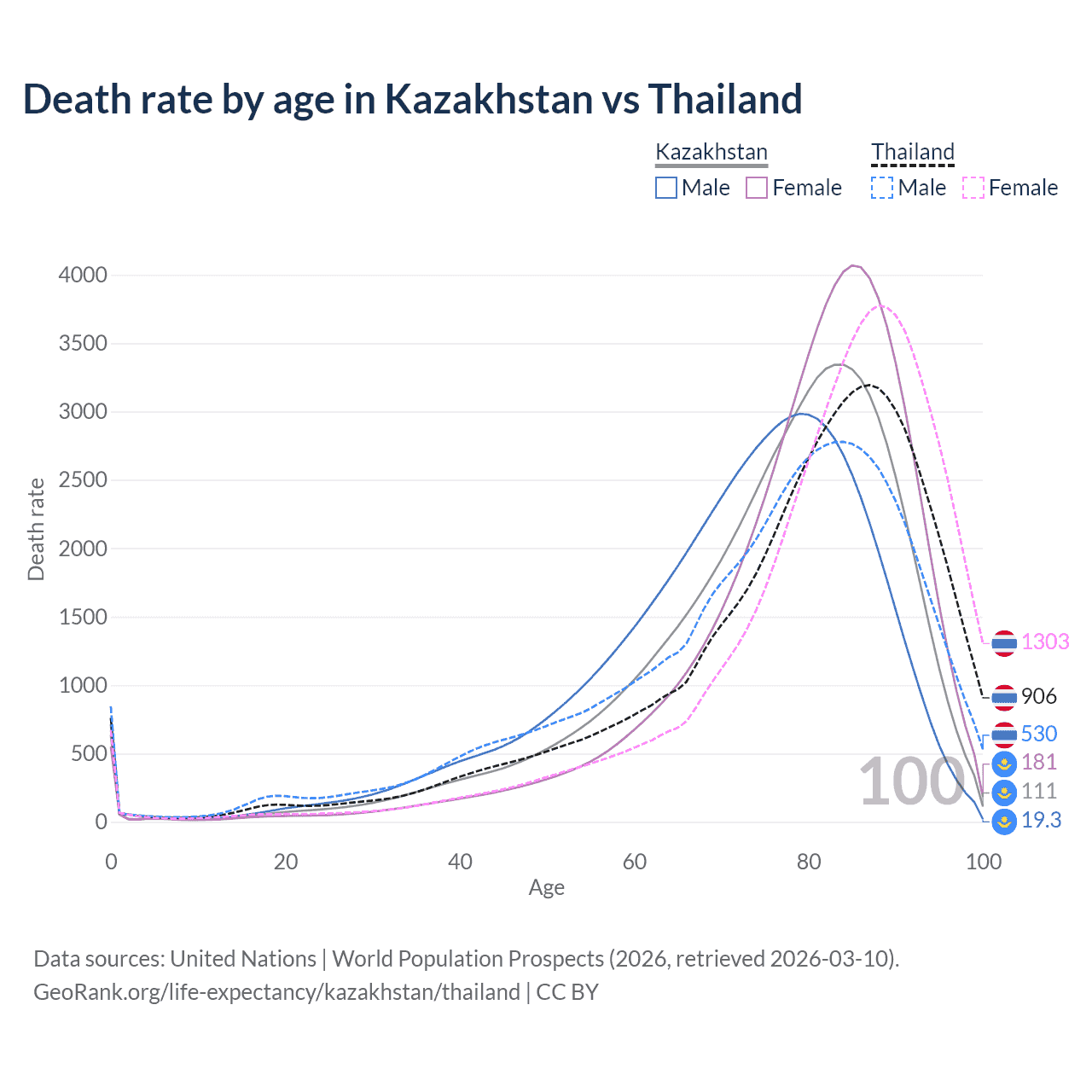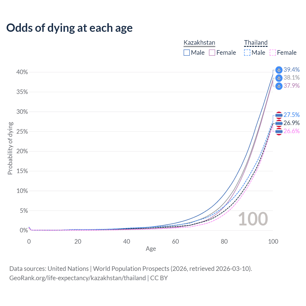 This life expectancy calculator shows the odds of living to 100, 95, 90, and below based on current age for both males and females in Kazakhstan and Thailand, along with mean and median age of death. The calculations are based on the 2026 life tables (actuarial tables) from the UN World Population Prospects.