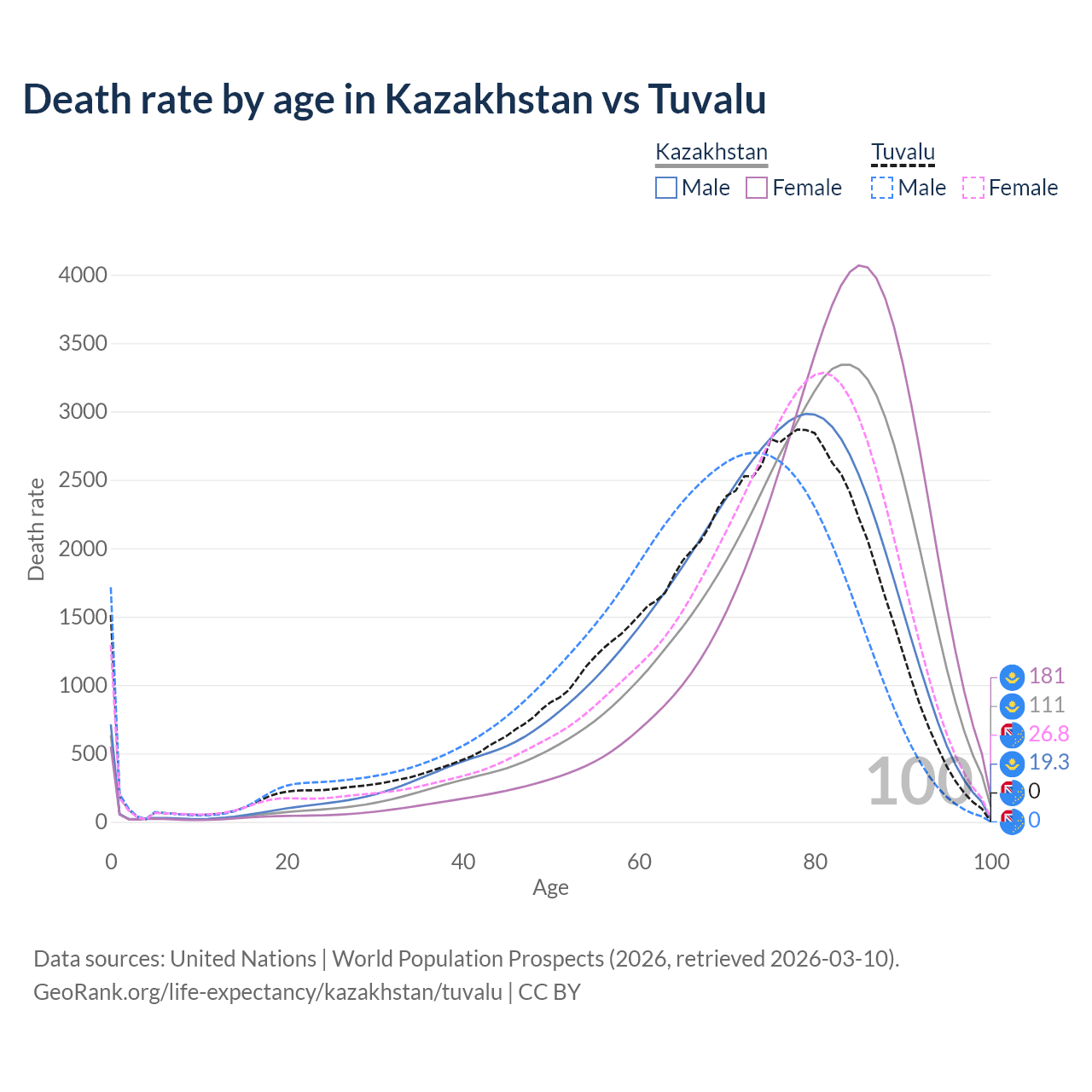 In Kazakhstan, the most common age of death is 84, compared to 78 in Tuvalu. The median age of death is 78.6 in Kazakhstan and 71.9 in Tuvalu, meaning only half of each cohort is expected to live past that age.