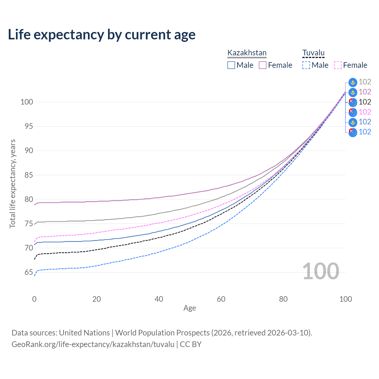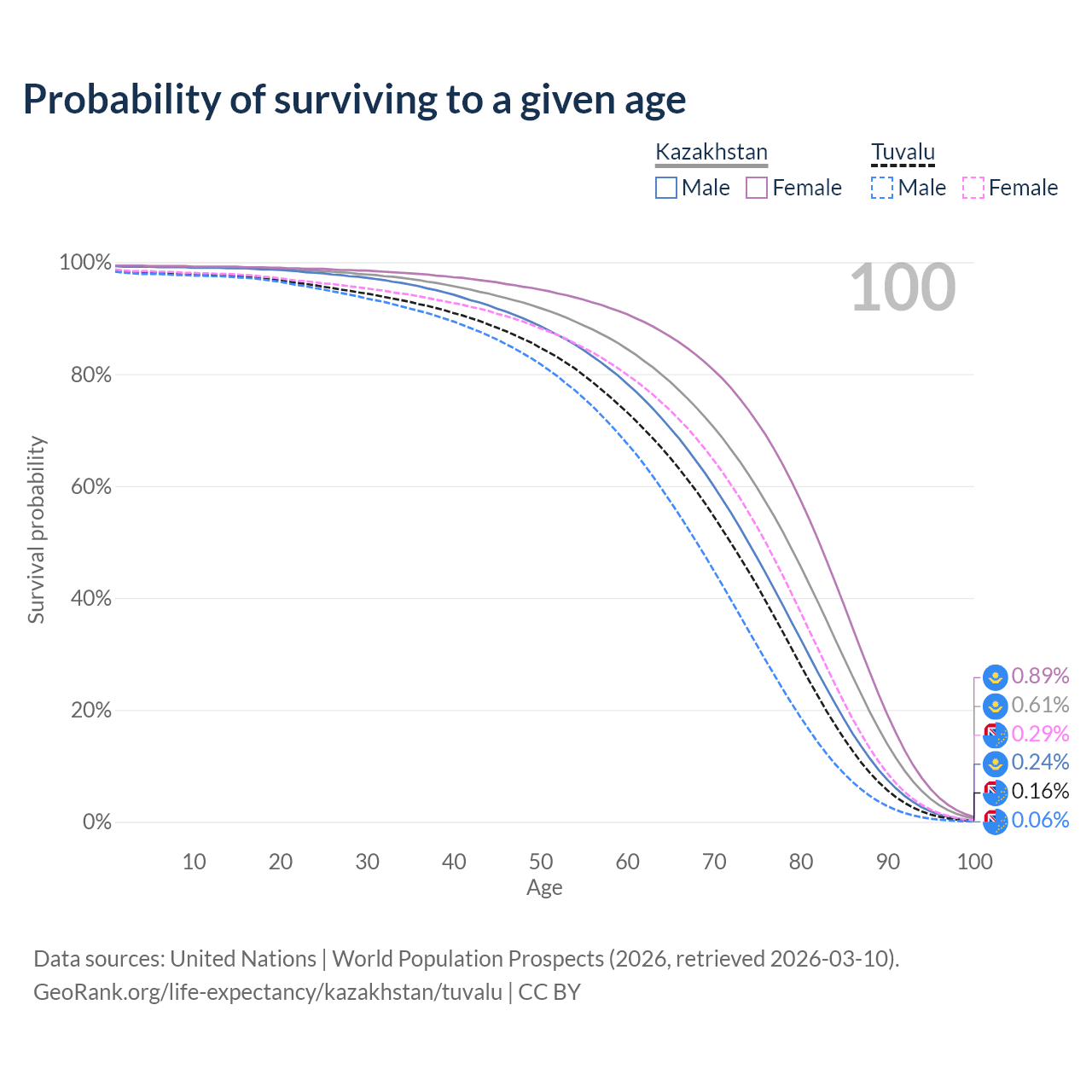 This life expectancy calculator shows the odds of living to 100, 95, 90, and below based on current age for both males and females in Kazakhstan and Tuvalu, along with mean and median age of death. The calculations are based on the 2026 life tables (actuarial tables) from the UN World Population Prospects.