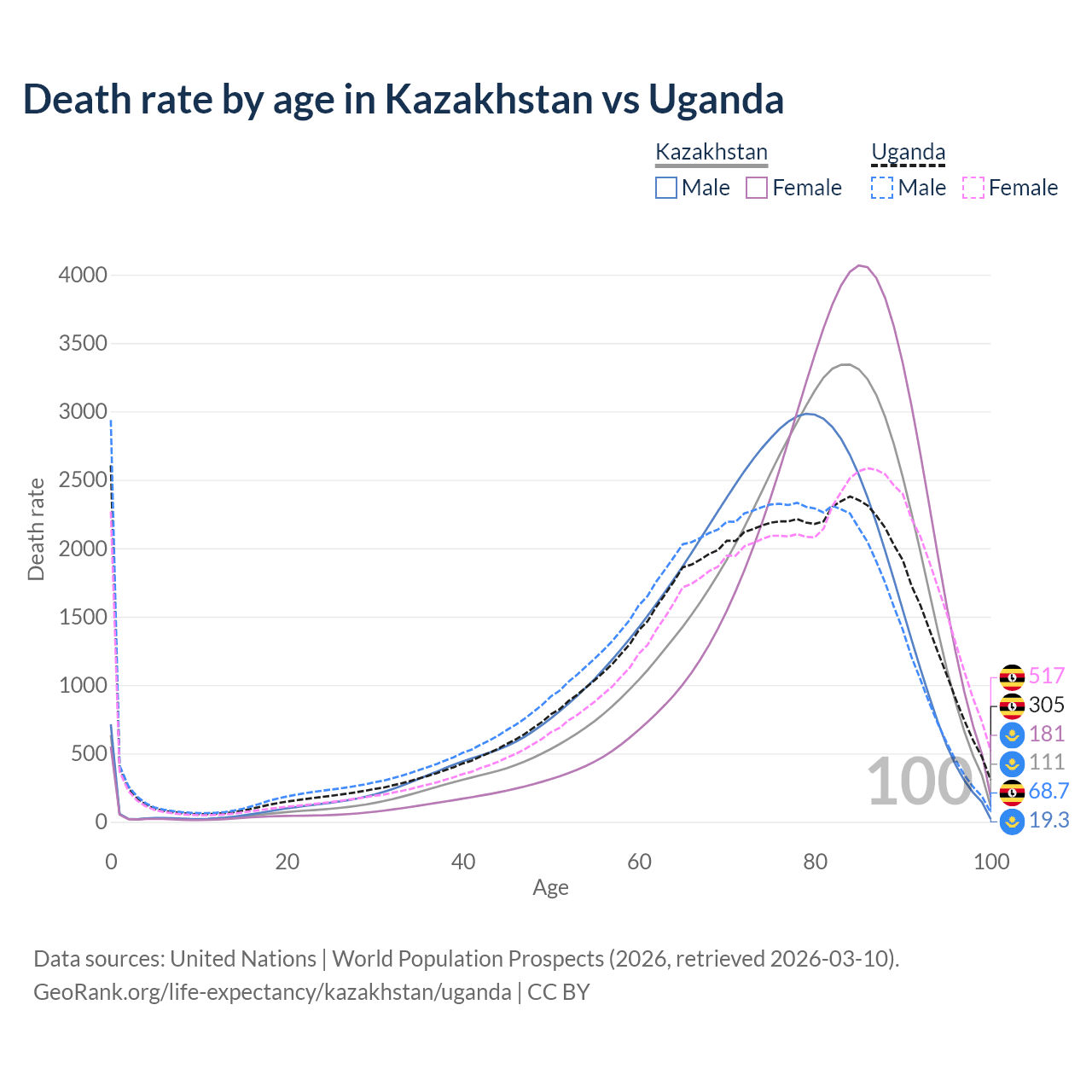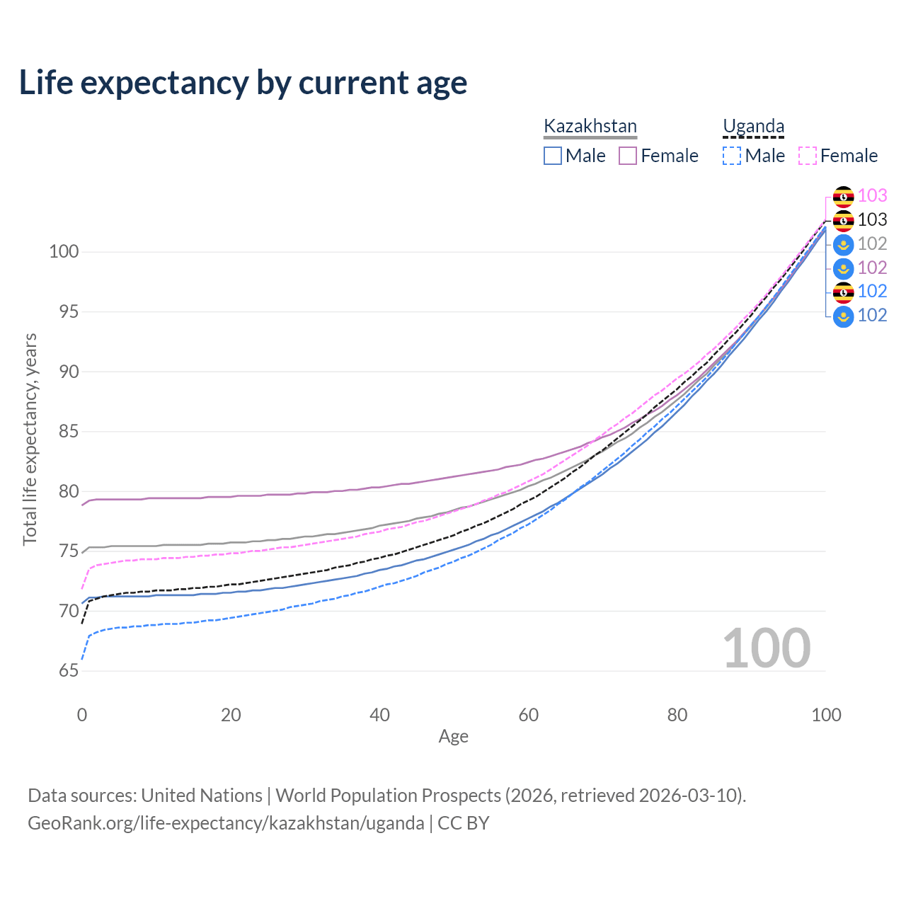 This life expectancy calculator shows the odds of living to 100, 95, 90, and below based on current age for both males and females in Kazakhstan and Uganda, along with mean and median age of death. The calculations are based on the 2026 life tables (actuarial tables) from the UN World Population Prospects.