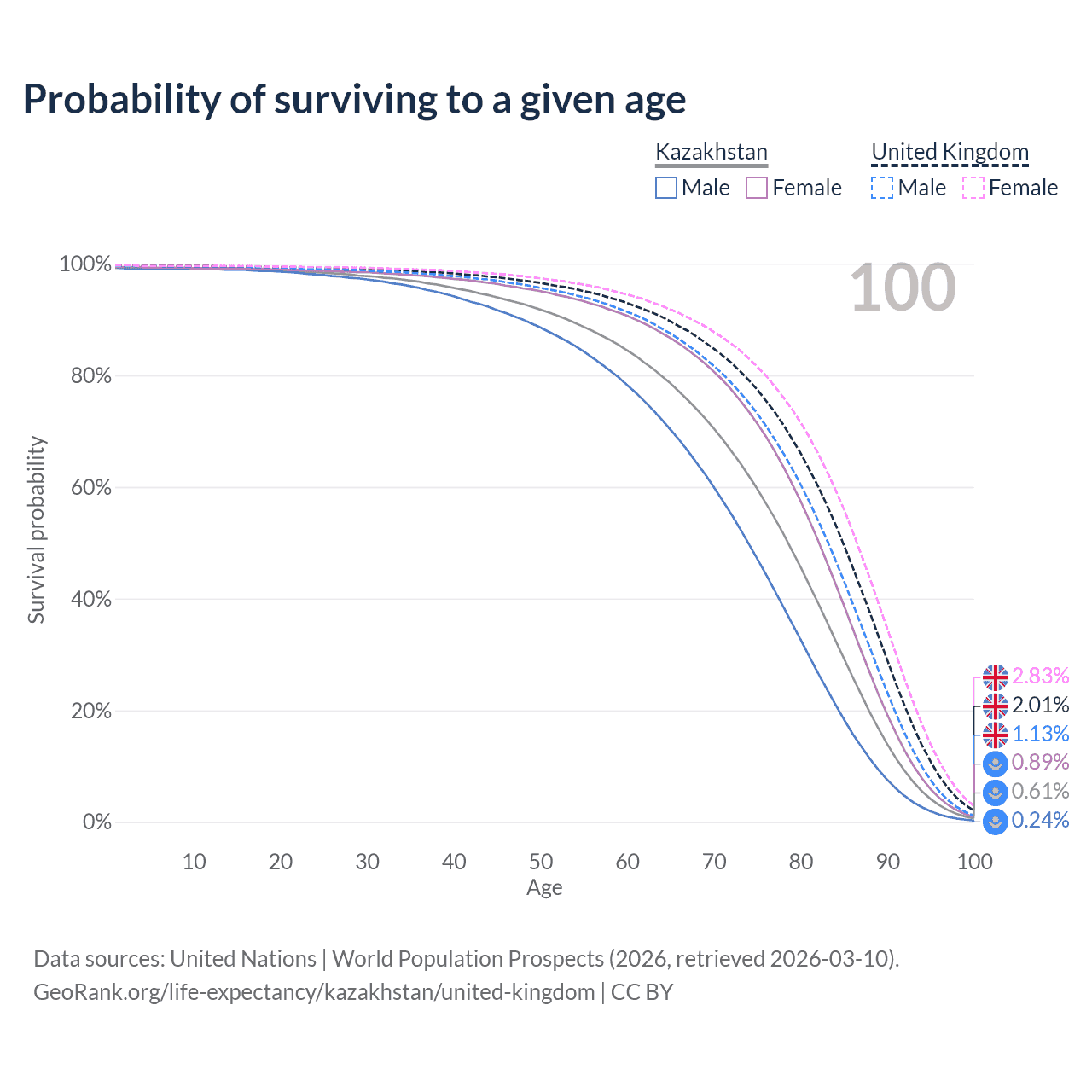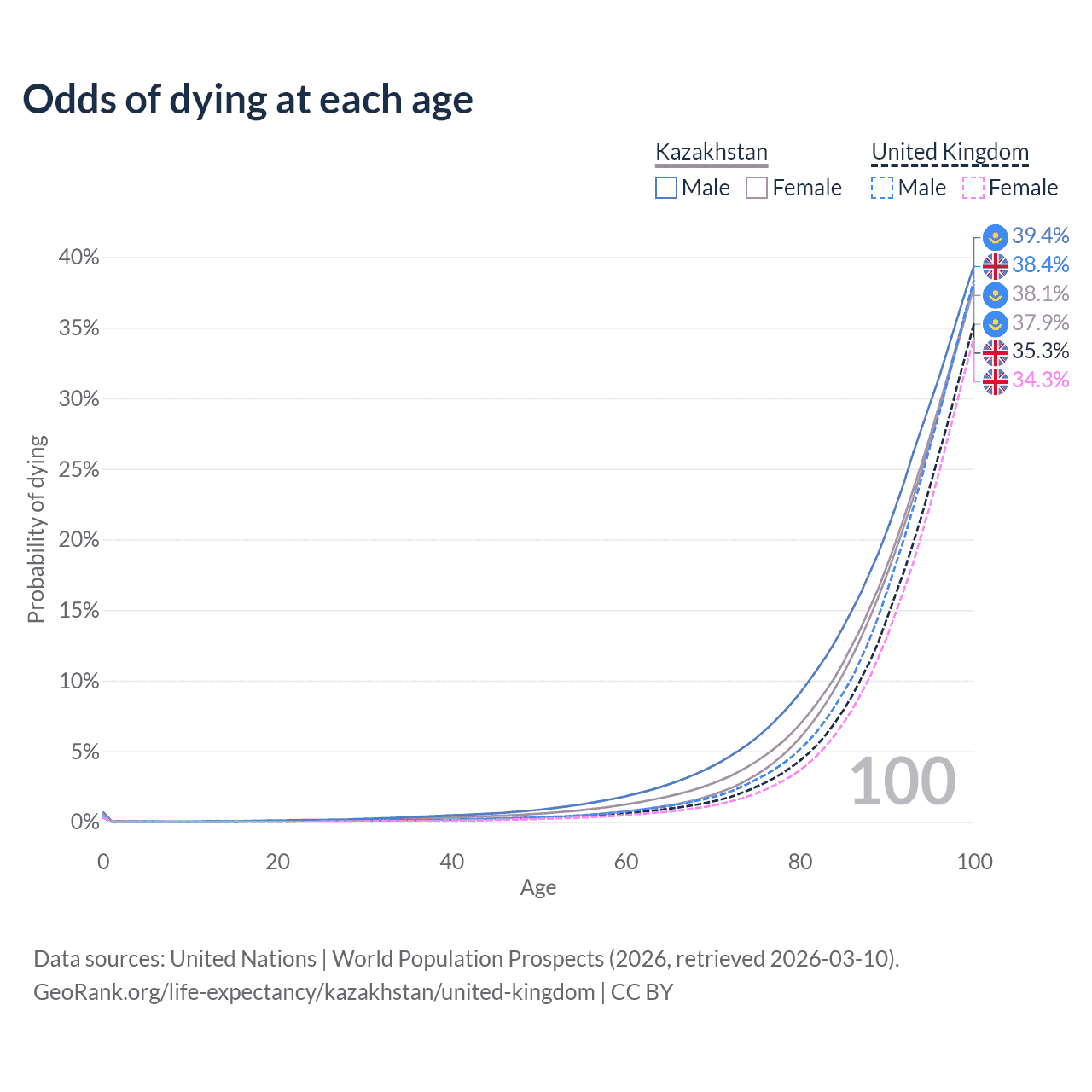This life expectancy calculator shows the odds of living to 100, 95, 90, and below based on current age for both males and females in Kazakhstan and the United Kingdom, along with mean and median age of death. The calculations are based on the 2026 life tables (actuarial tables) from the UN World Population Prospects.