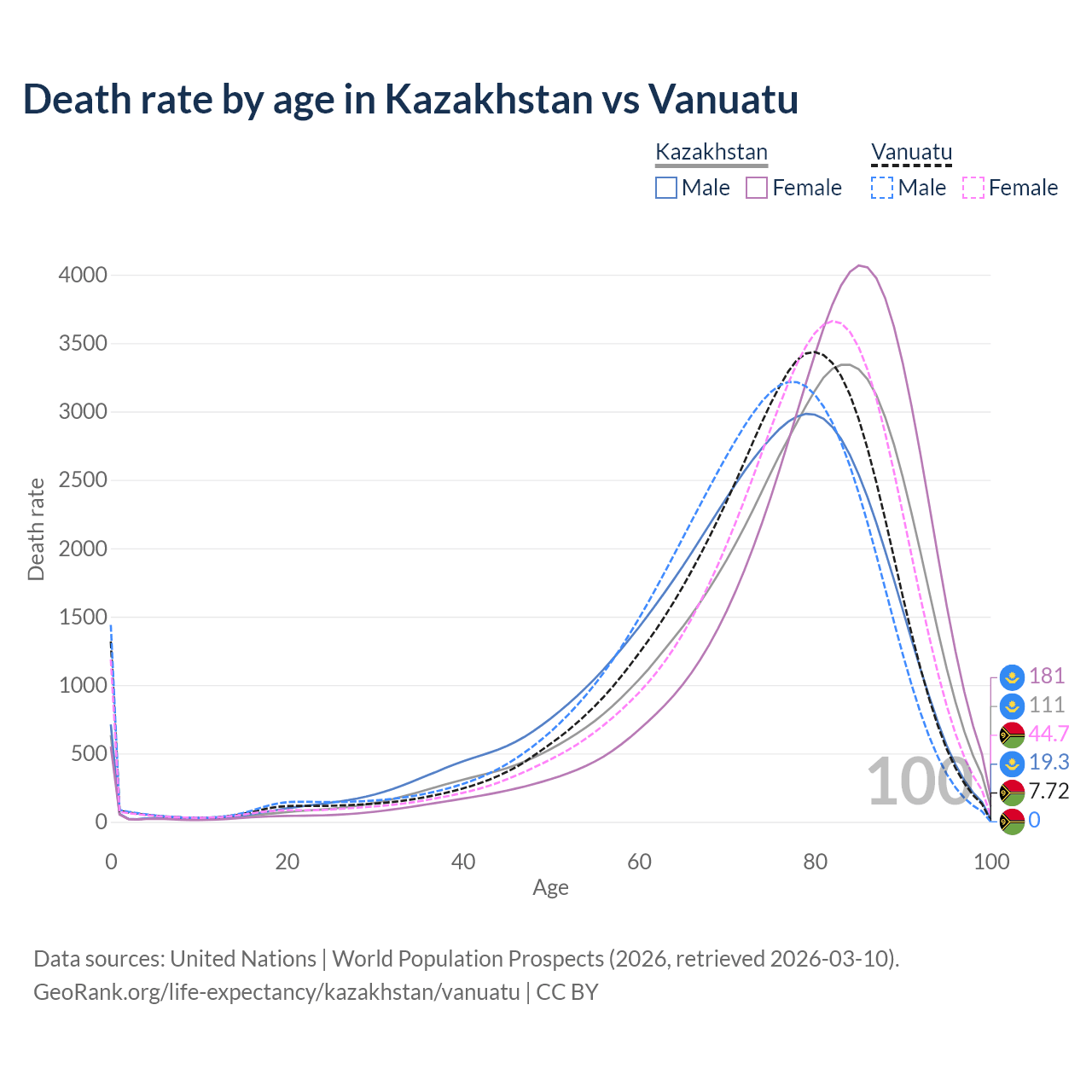 In Kazakhstan, the most common age of death is 84, compared to 80 in Vanuatu. The median age of death is 78.6 in Kazakhstan and 75.9 in Vanuatu, meaning only half of each cohort is expected to live past that age.