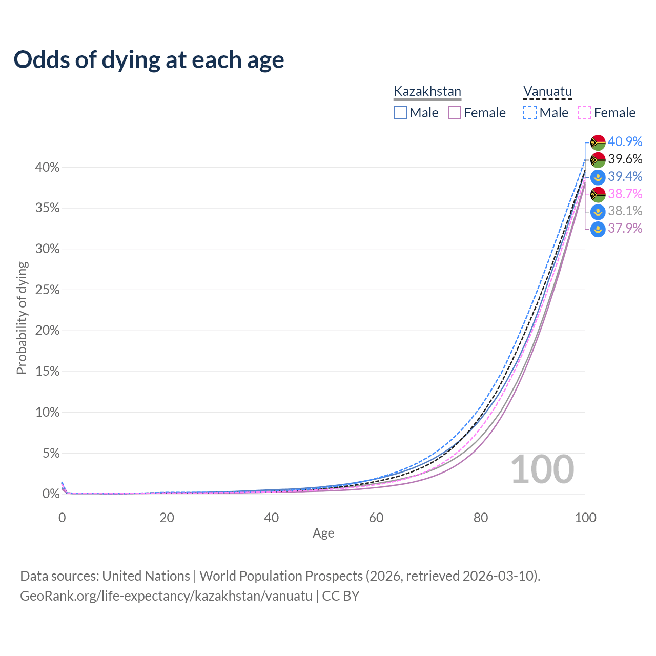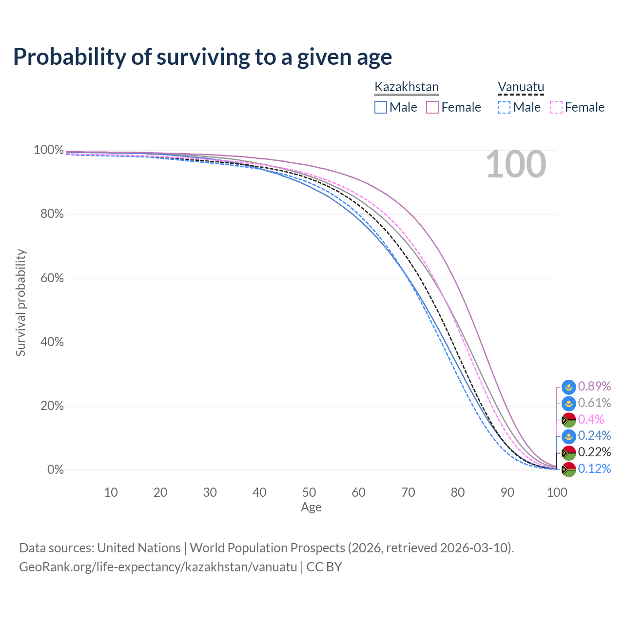 This life expectancy calculator shows the odds of living to 100, 95, 90, and below based on current age for both males and females in Kazakhstan and Vanuatu, along with mean and median age of death. The calculations are based on the 2026 life tables (actuarial tables) from the UN World Population Prospects.