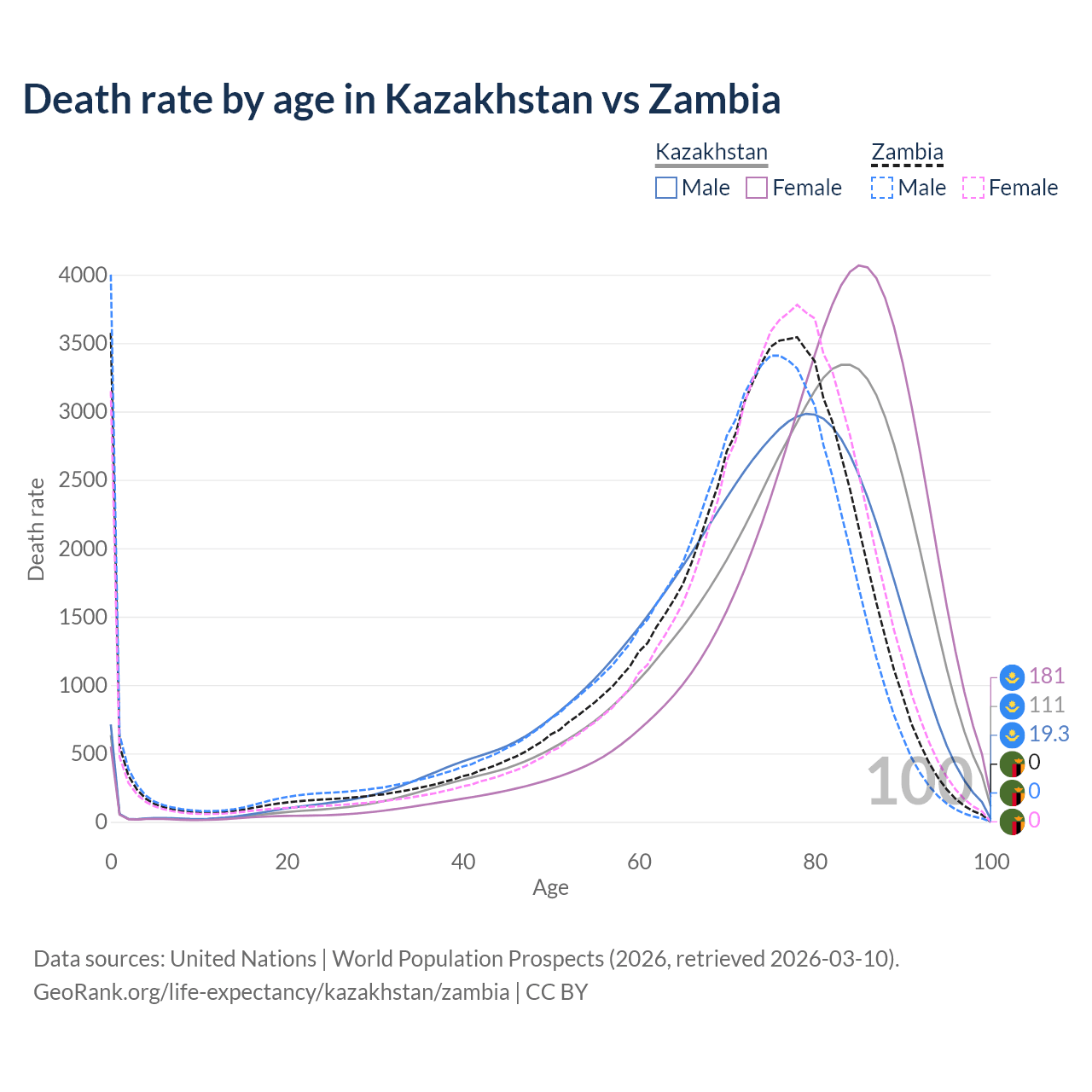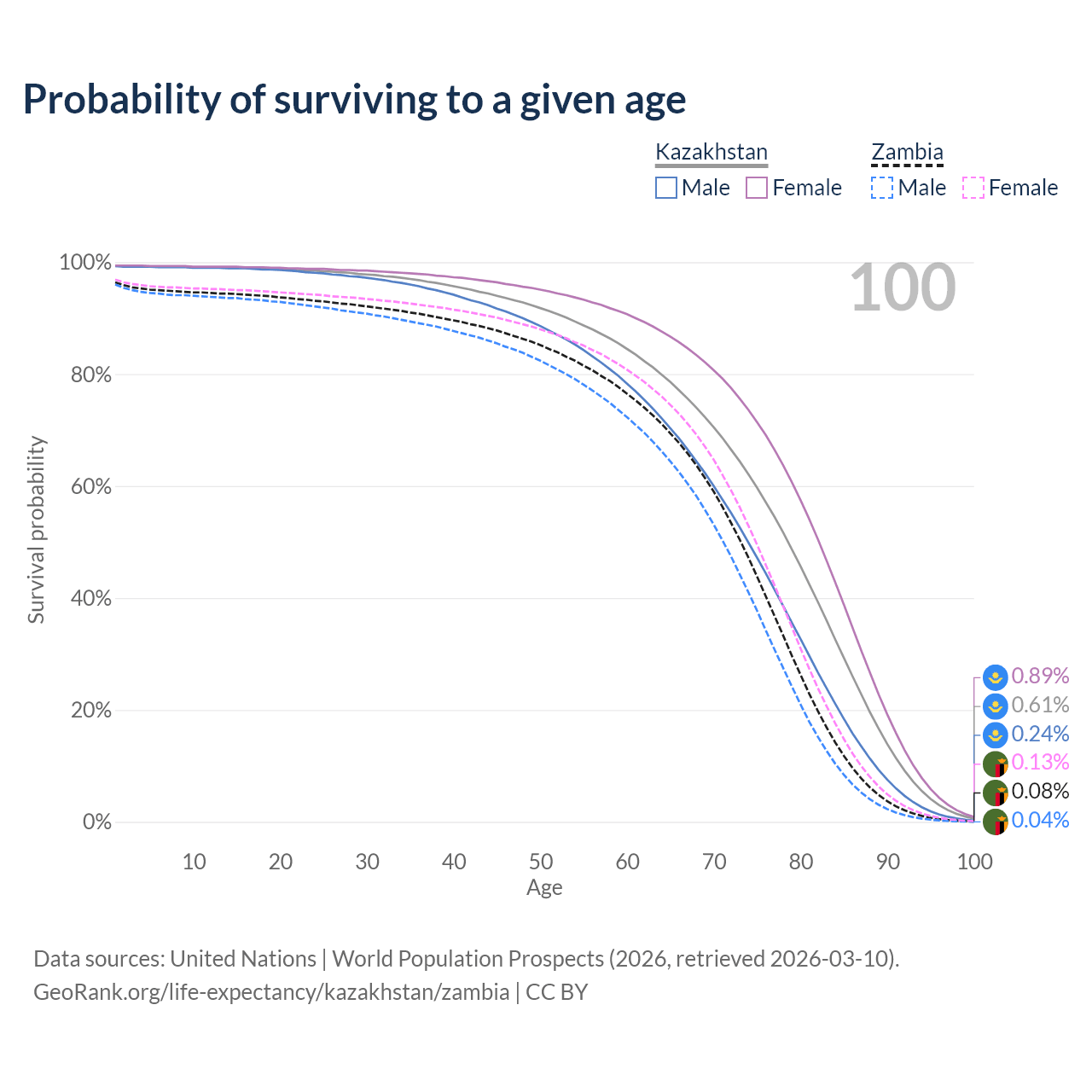 This life expectancy calculator shows the odds of living to 100, 95, 90, and below based on current age for both males and females in Kazakhstan and Zambia, along with mean and median age of death. The calculations are based on the 2026 life tables (actuarial tables) from the UN World Population Prospects.