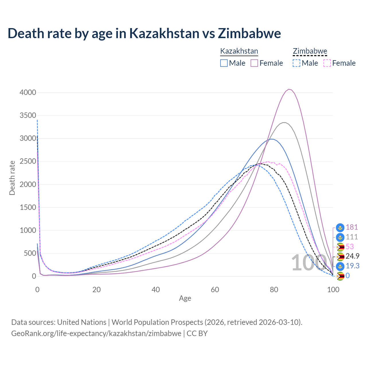 In Kazakhstan, the most common age of death is 84, compared to 0 in Zimbabwe. The median age of death is 78.6 in Kazakhstan and 68.8 in Zimbabwe, meaning only half of each cohort is expected to live past that age.
