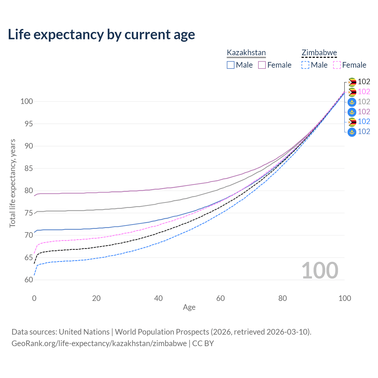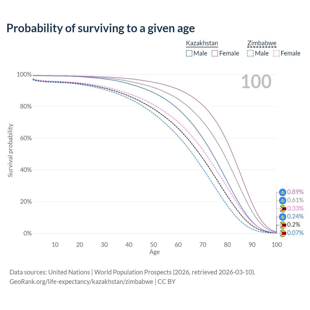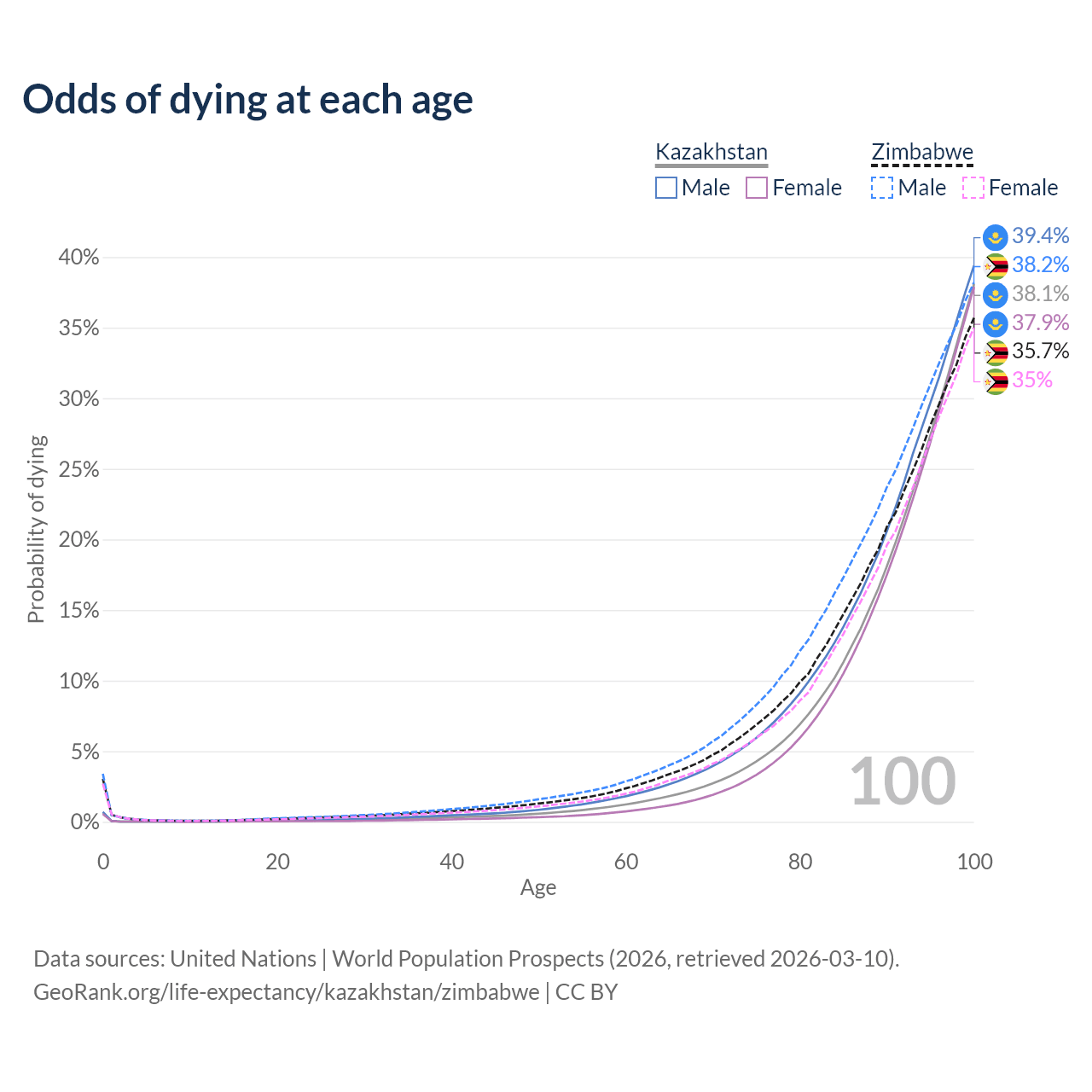 This life expectancy calculator shows the odds of living to 100, 95, 90, and below based on current age for both males and females in Kazakhstan and Zimbabwe, along with mean and median age of death. The calculations are based on the 2026 life tables (actuarial tables) from the UN World Population Prospects.