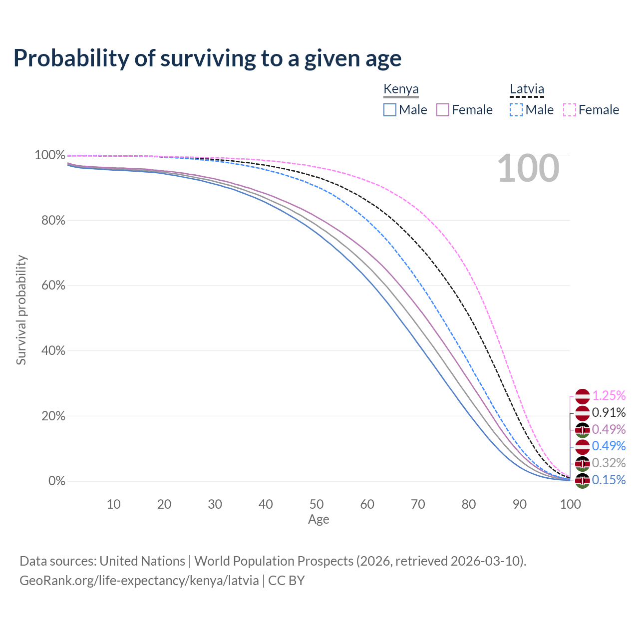 This life expectancy calculator shows the odds of living to 100, 95, 90, and below based on current age for both males and females in Kenya and Latvia, along with mean and median age of death. The calculations are based on the 2026 life tables (actuarial tables) from the UN World Population Prospects.