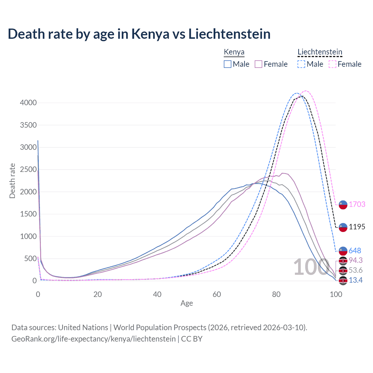 In Kenya, the most common age of death is 0, compared to 89 in Liechtenstein. The median age of death is 68.8 in Kenya and 86.3 in Liechtenstein, meaning only half of each cohort is expected to live past that age.