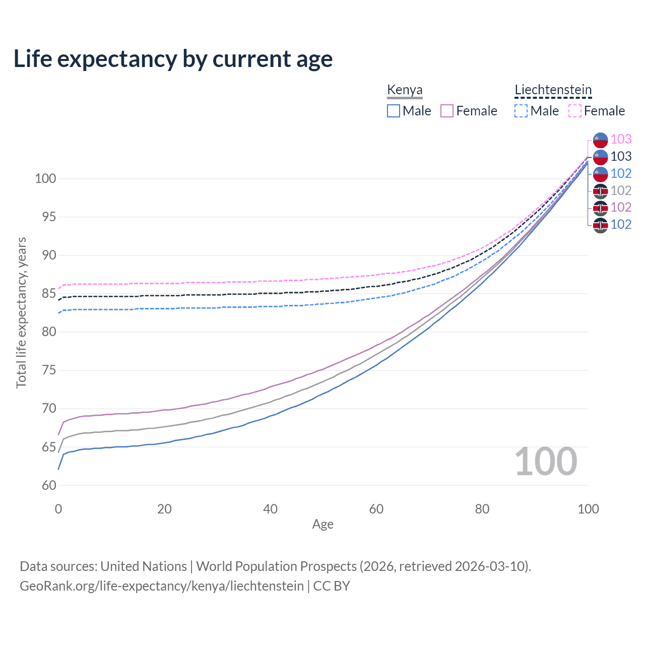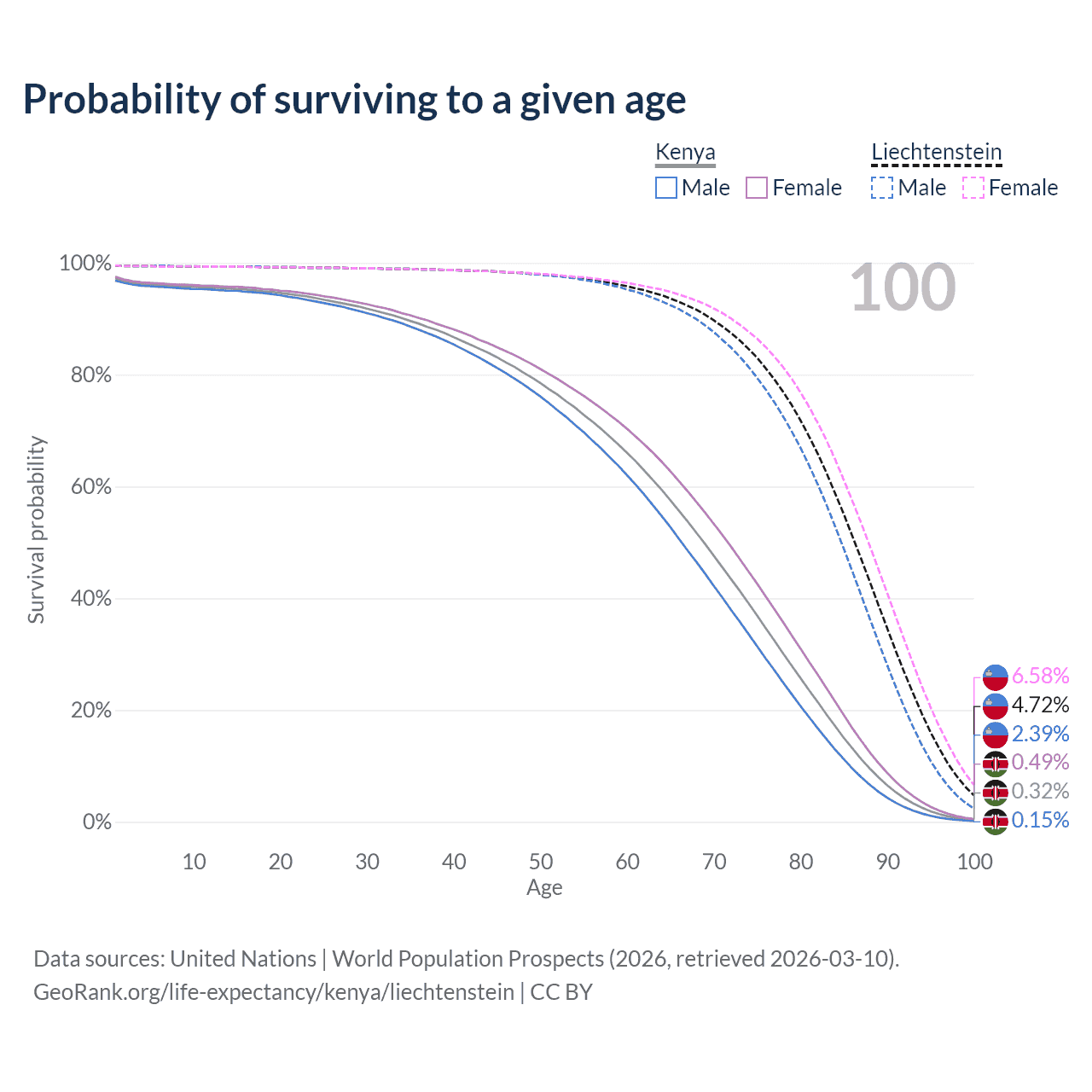 This life expectancy calculator shows the odds of living to 100, 95, 90, and below based on current age for both males and females in Kenya and Liechtenstein, along with mean and median age of death. The calculations are based on the 2026 life tables (actuarial tables) from the UN World Population Prospects.