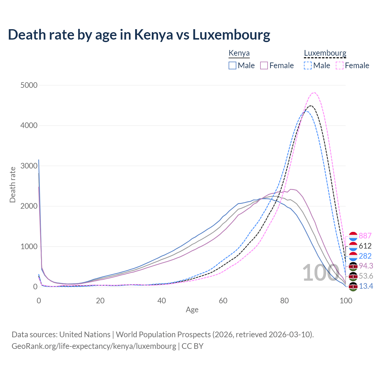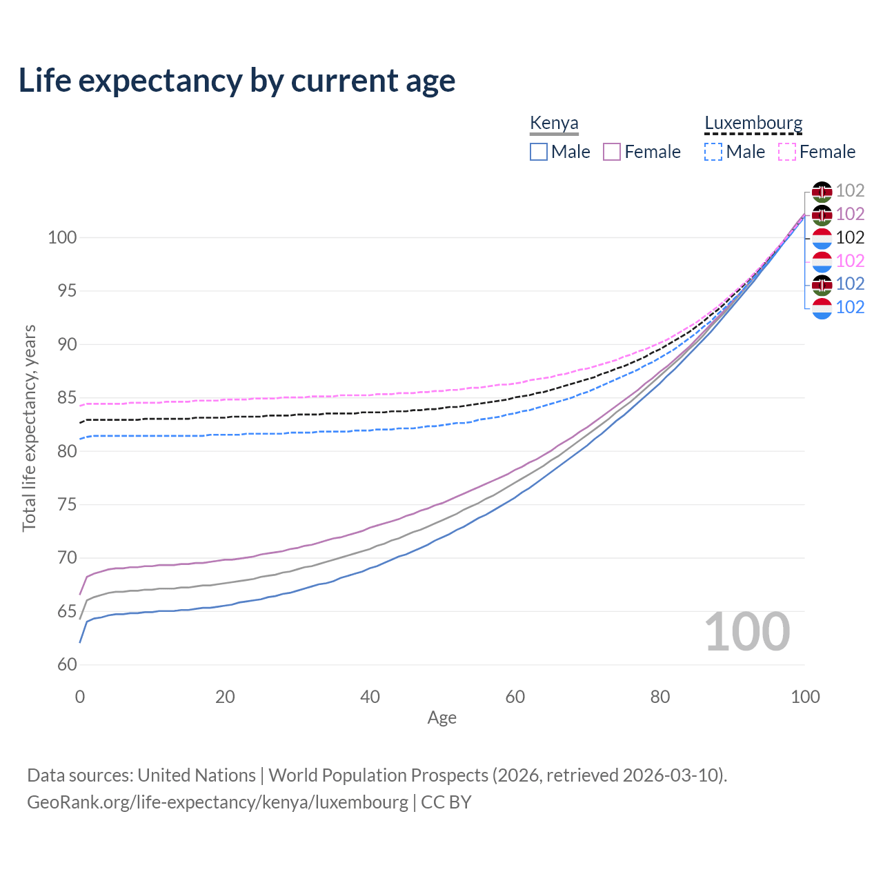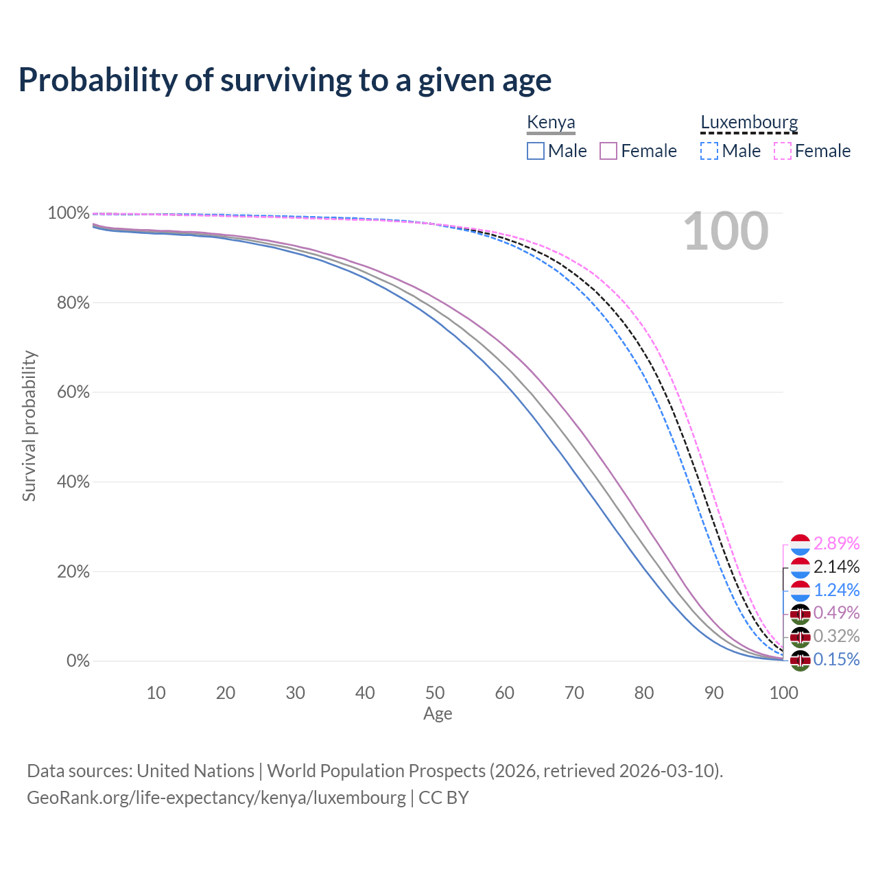 This life expectancy calculator shows the odds of living to 100, 95, 90, and below based on current age for both males and females in Kenya and Luxembourg, along with mean and median age of death. The calculations are based on the 2026 life tables (actuarial tables) from the UN World Population Prospects.