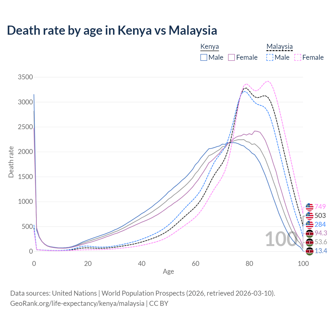 In Kenya, the most common age of death is 0, compared to 79 in Malaysia. The median age of death is 68.8 in Kenya and 79.8 in Malaysia, meaning only half of each cohort is expected to live past that age.