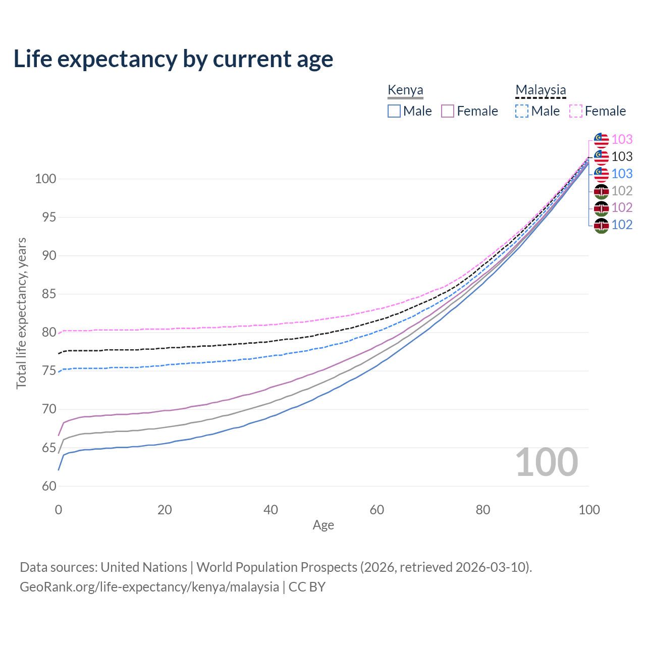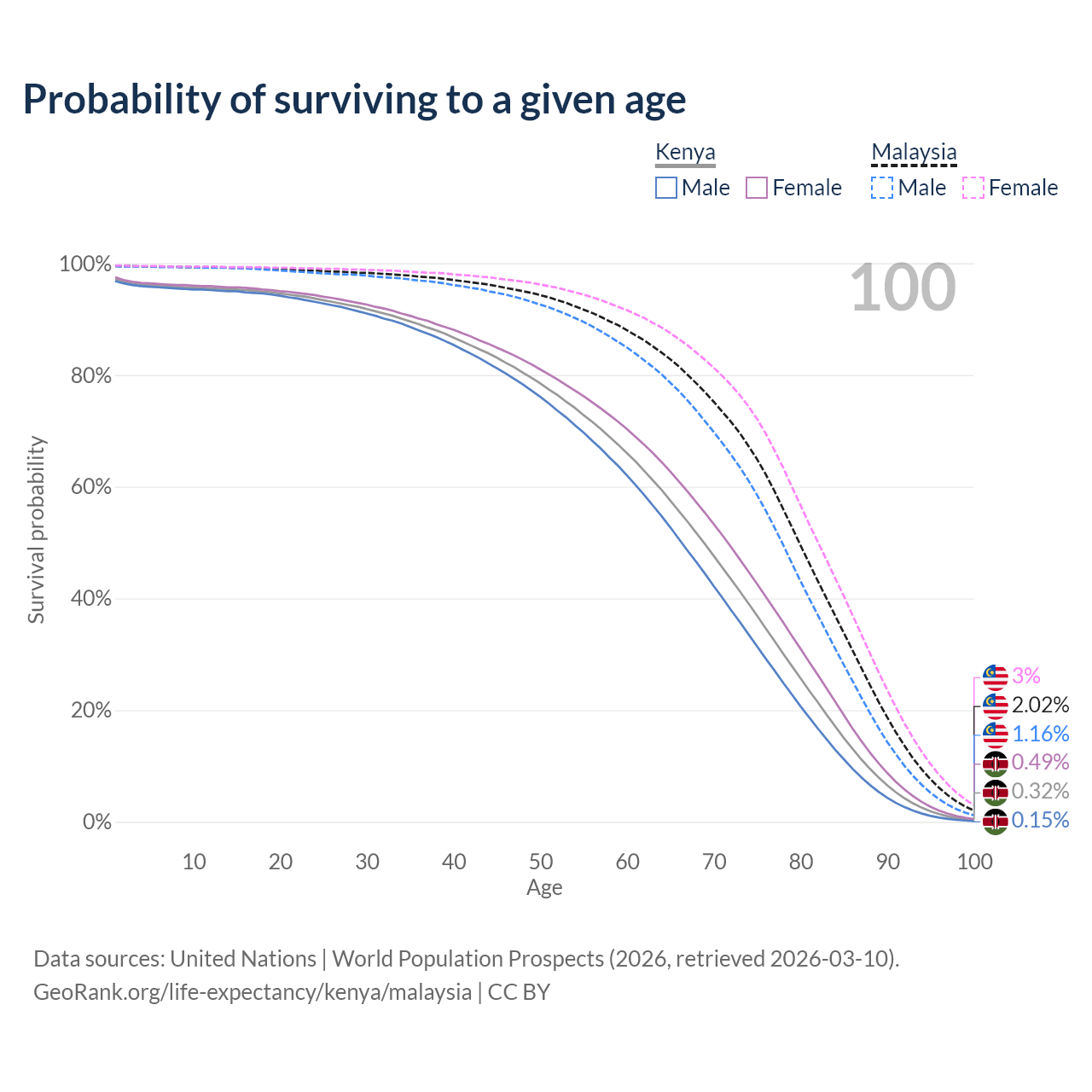 This life expectancy calculator shows the odds of living to 100, 95, 90, and below based on current age for both males and females in Kenya and Malaysia, along with mean and median age of death. The calculations are based on the 2026 life tables (actuarial tables) from the UN World Population Prospects.