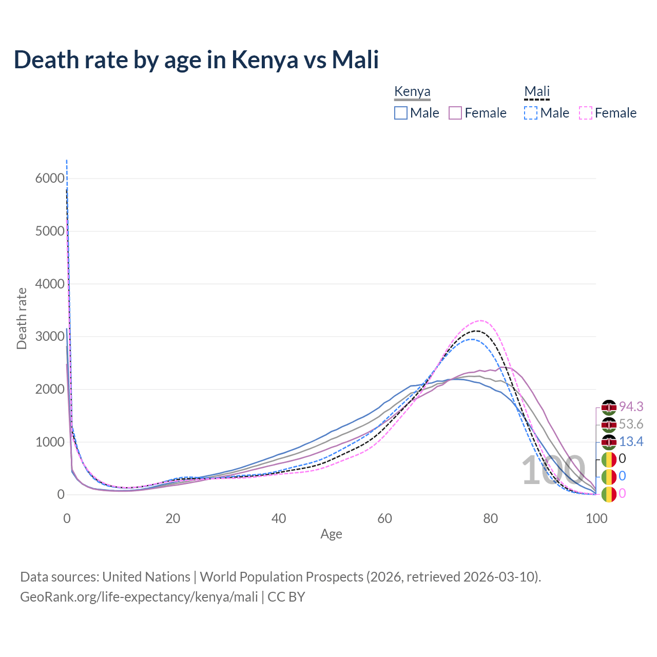 In Kenya, the most common age of death is 0, compared to 0 in Mali. The median age of death is 68.8 in Kenya and 70.2 in Mali, meaning only half of each cohort is expected to live past that age.