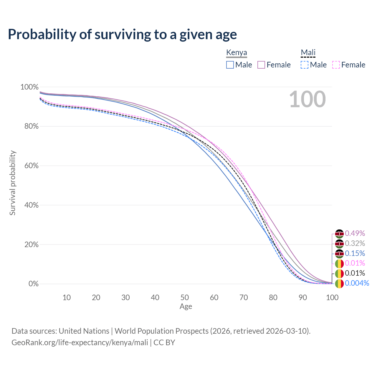This life expectancy calculator shows the odds of living to 100, 95, 90, and below based on current age for both males and females in Kenya and Mali, along with mean and median age of death. The calculations are based on the 2026 life tables (actuarial tables) from the UN World Population Prospects.