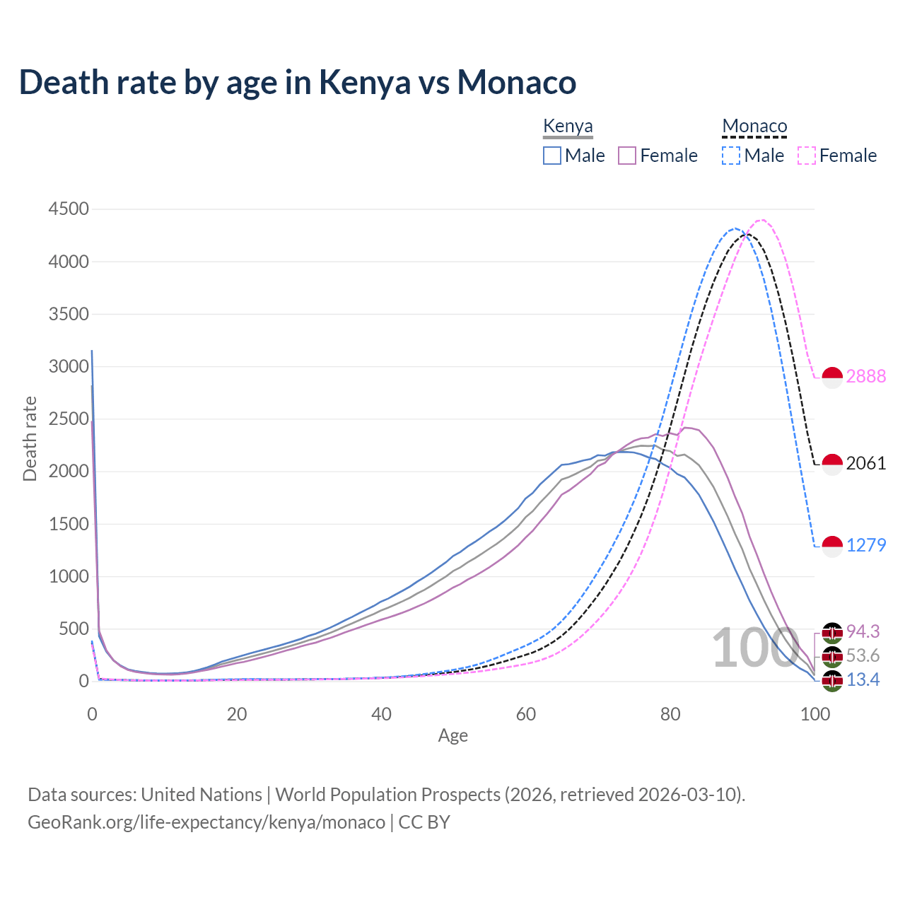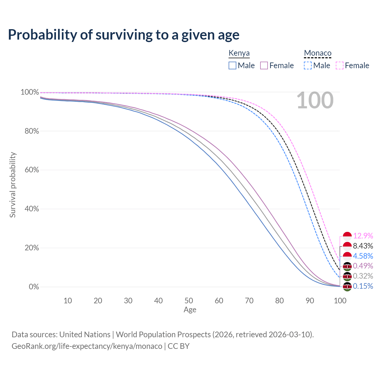 This life expectancy calculator shows the odds of living to 100, 95, 90, and below based on current age for both males and females in Kenya and Monaco, along with mean and median age of death. The calculations are based on the 2026 life tables (actuarial tables) from the UN World Population Prospects.