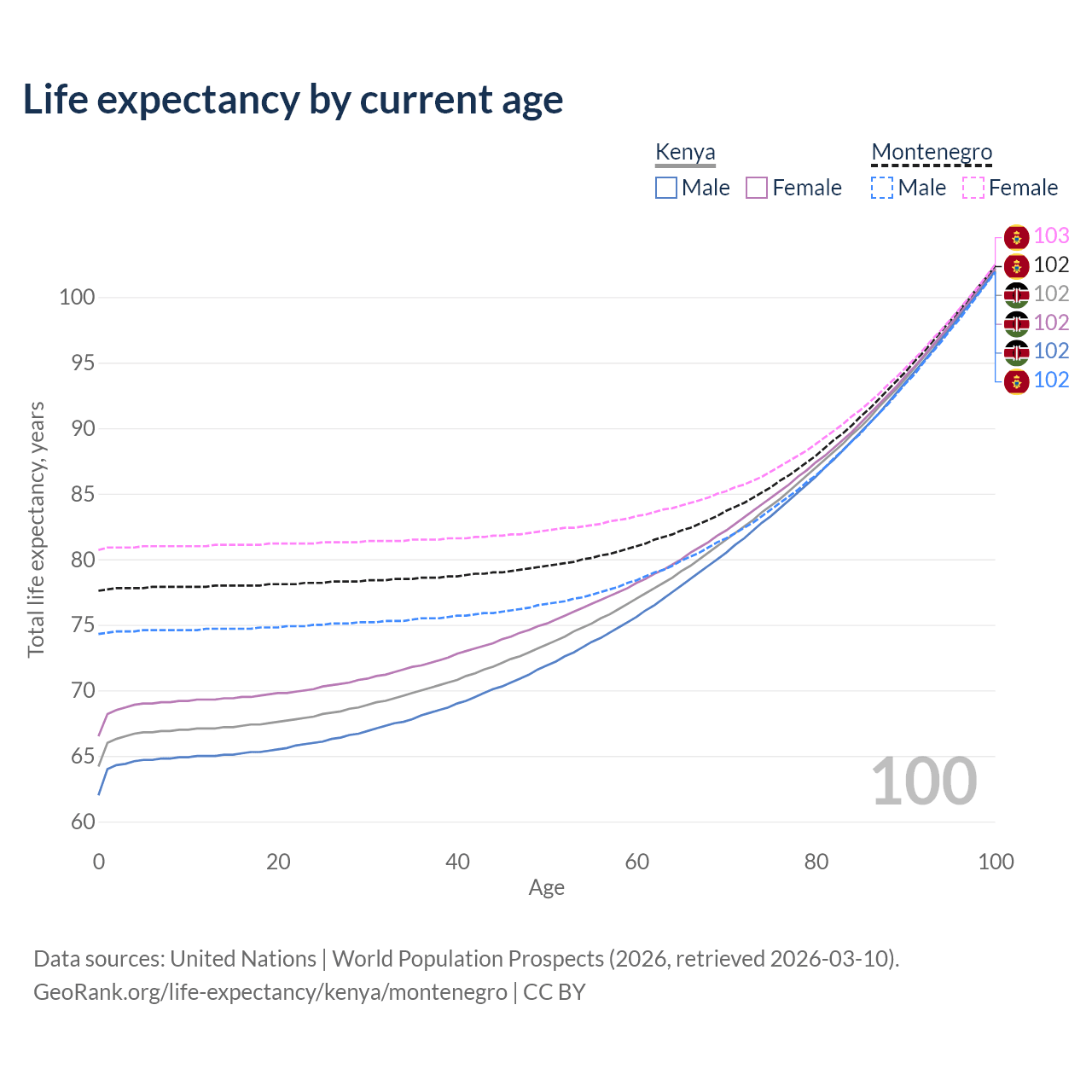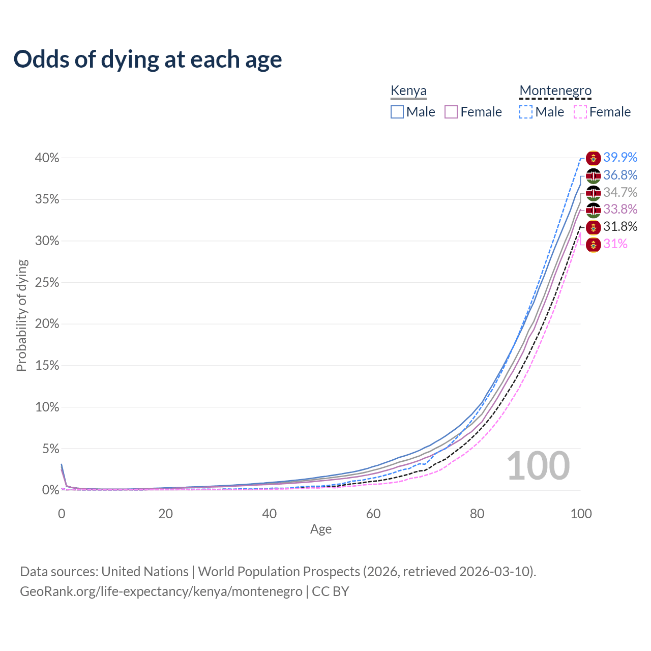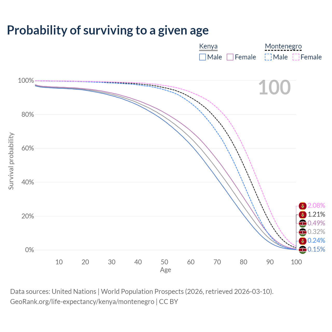 This life expectancy calculator shows the odds of living to 100, 95, 90, and below based on current age for both males and females in Kenya and Montenegro, along with mean and median age of death. The calculations are based on the 2026 life tables (actuarial tables) from the UN World Population Prospects.