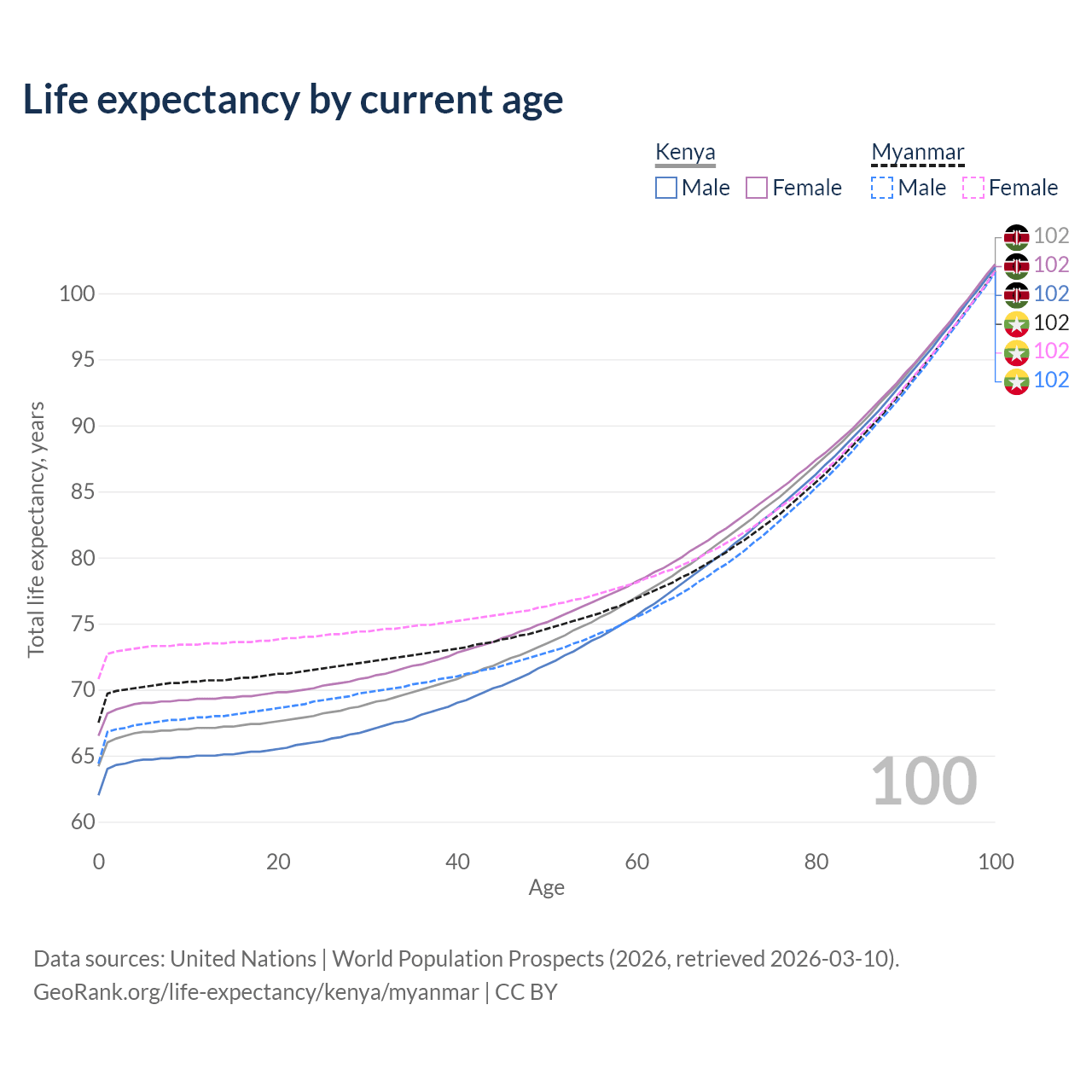 This life expectancy calculator shows the odds of living to 100, 95, 90, and below based on current age for both males and females in Kenya and Myanmar, along with mean and median age of death. The calculations are based on the 2026 life tables (actuarial tables) from the UN World Population Prospects.