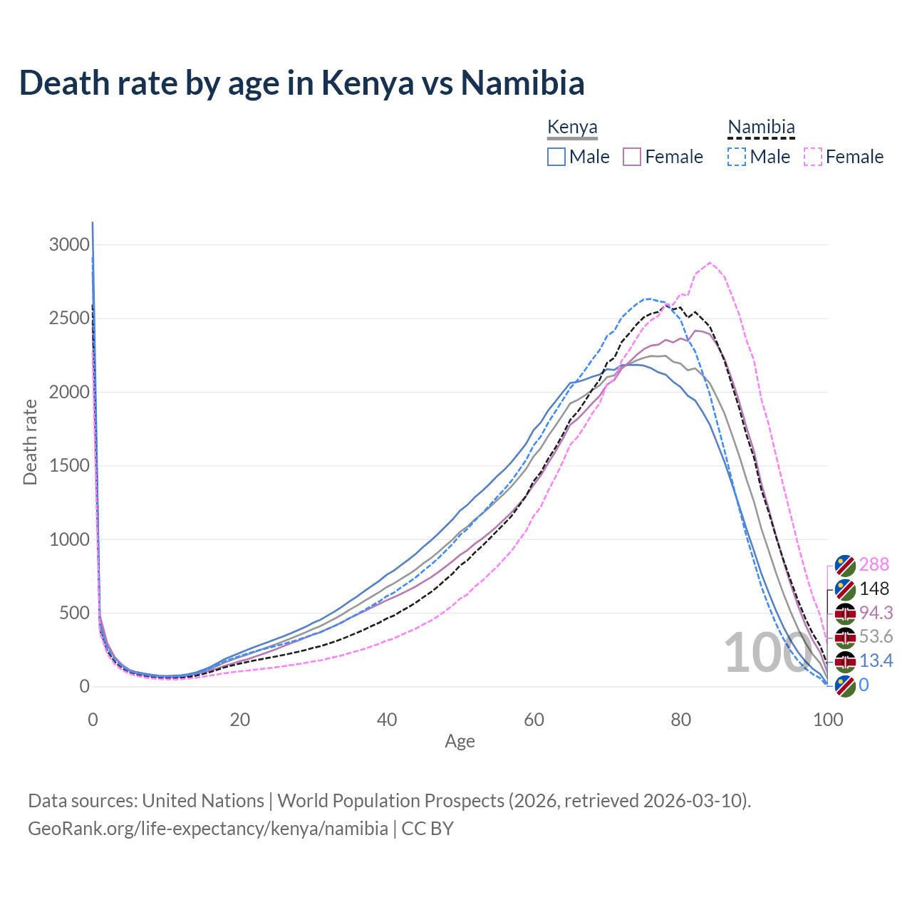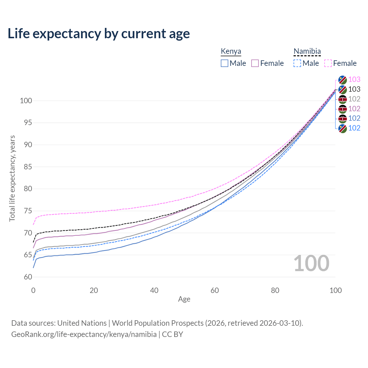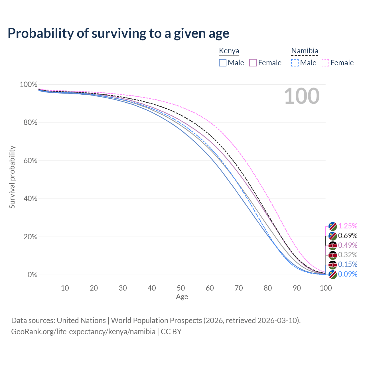 This life expectancy calculator shows the odds of living to 100, 95, 90, and below based on current age for both males and females in Kenya and Namibia, along with mean and median age of death. The calculations are based on the 2026 life tables (actuarial tables) from the UN World Population Prospects.