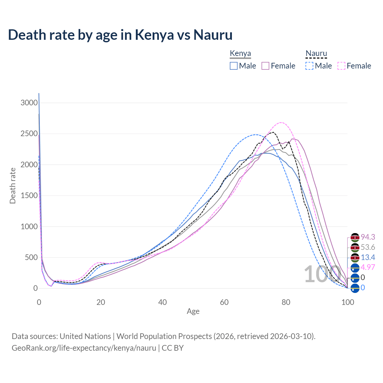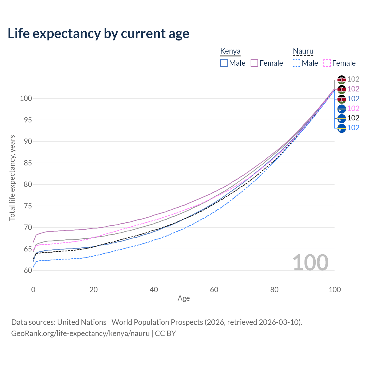 This life expectancy calculator shows the odds of living to 100, 95, 90, and below based on current age for both males and females in Kenya and Nauru, along with mean and median age of death. The calculations are based on the 2026 life tables (actuarial tables) from the UN World Population Prospects.
