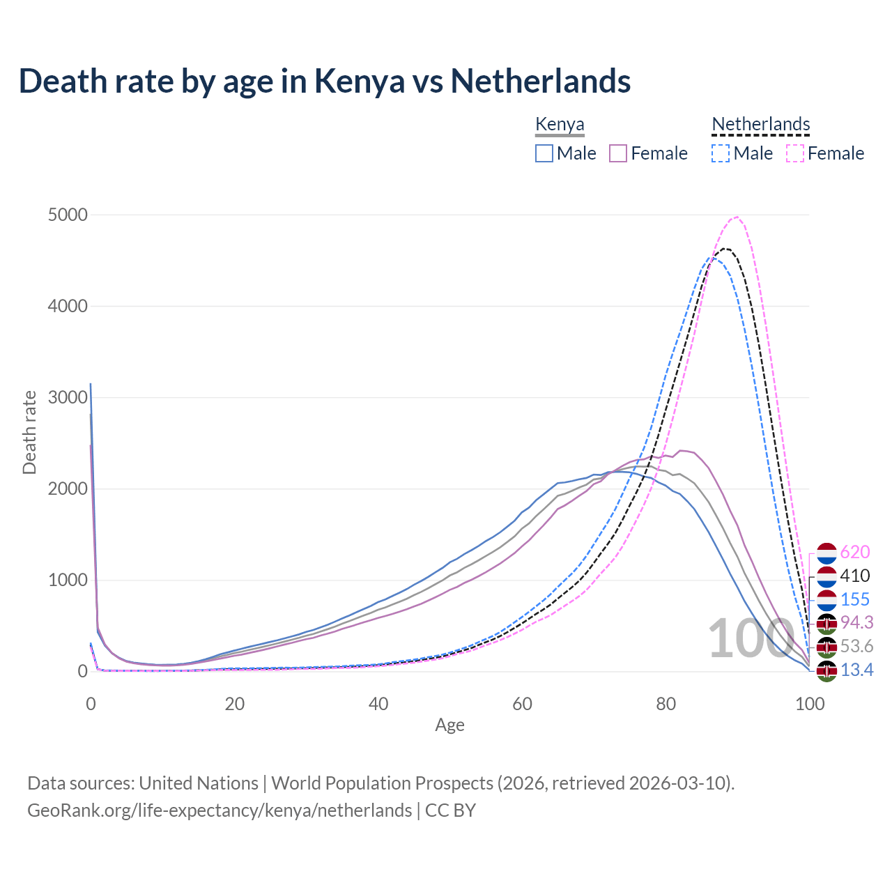 In Kenya, the most common age of death is 0, compared to 88 in the Netherlands. The median age of death is 68.8 in Kenya and 85.5 in the Netherlands, meaning only half of each cohort is expected to live past that age.