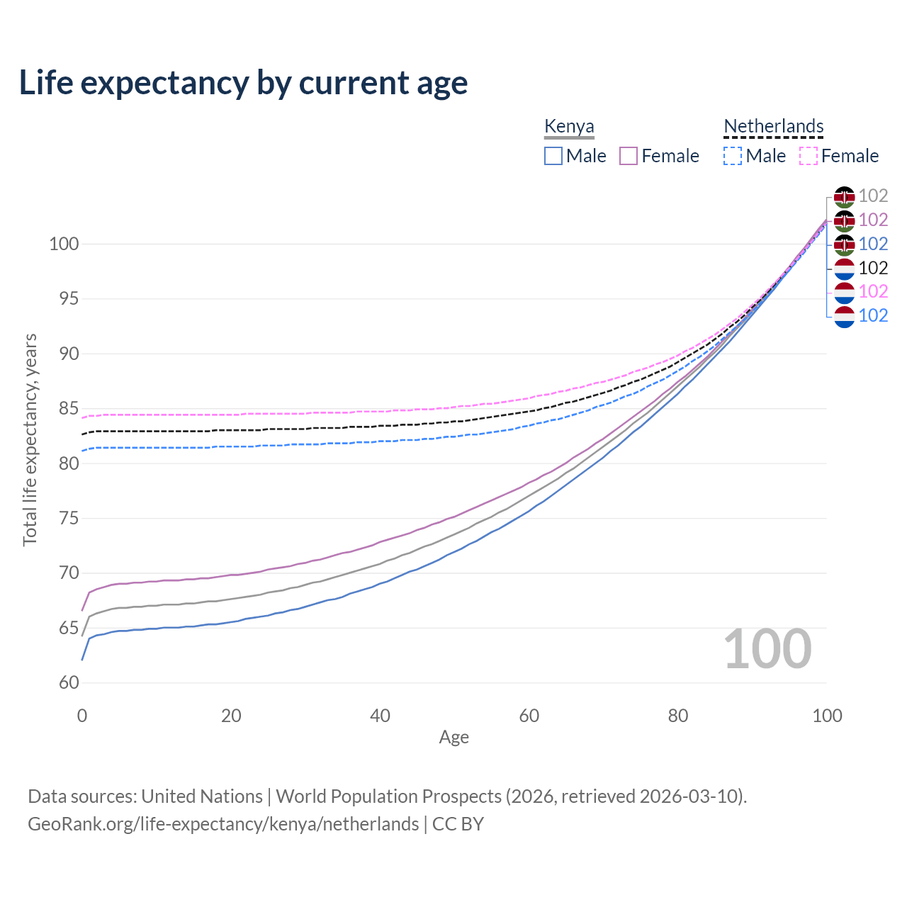 This life expectancy calculator shows the odds of living to 100, 95, 90, and below based on current age for both males and females in Kenya and the Netherlands, along with mean and median age of death. The calculations are based on the 2026 life tables (actuarial tables) from the UN World Population Prospects.