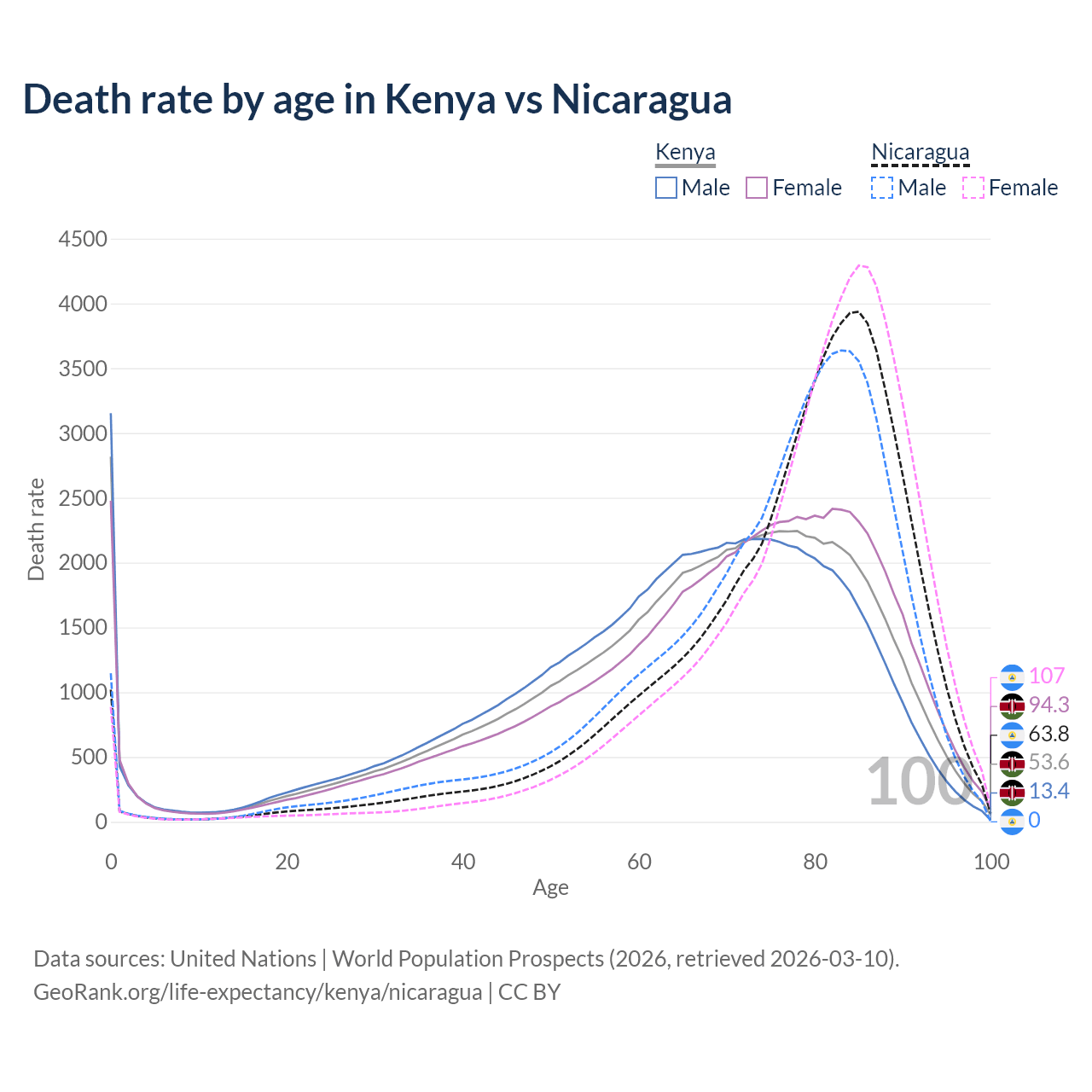 In Kenya, the most common age of death is 0, compared to 85 in Nicaragua. The median age of death is 68.8 in Kenya and 79.9 in Nicaragua, meaning only half of each cohort is expected to live past that age.