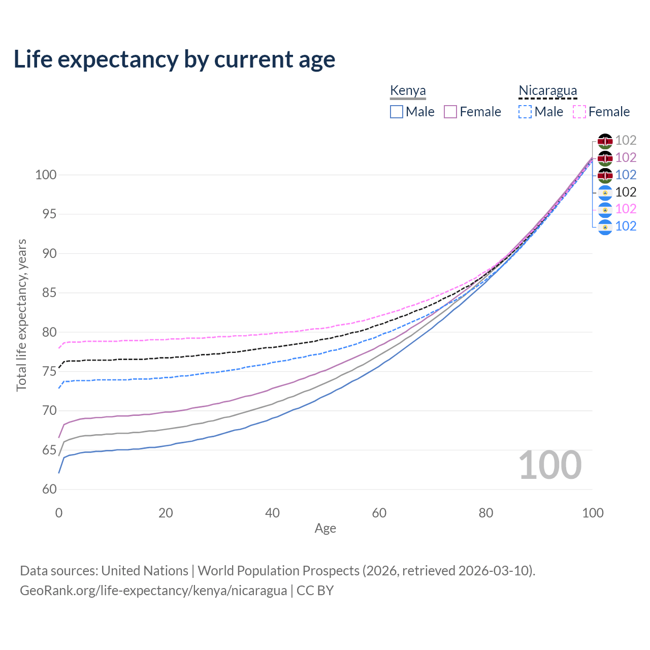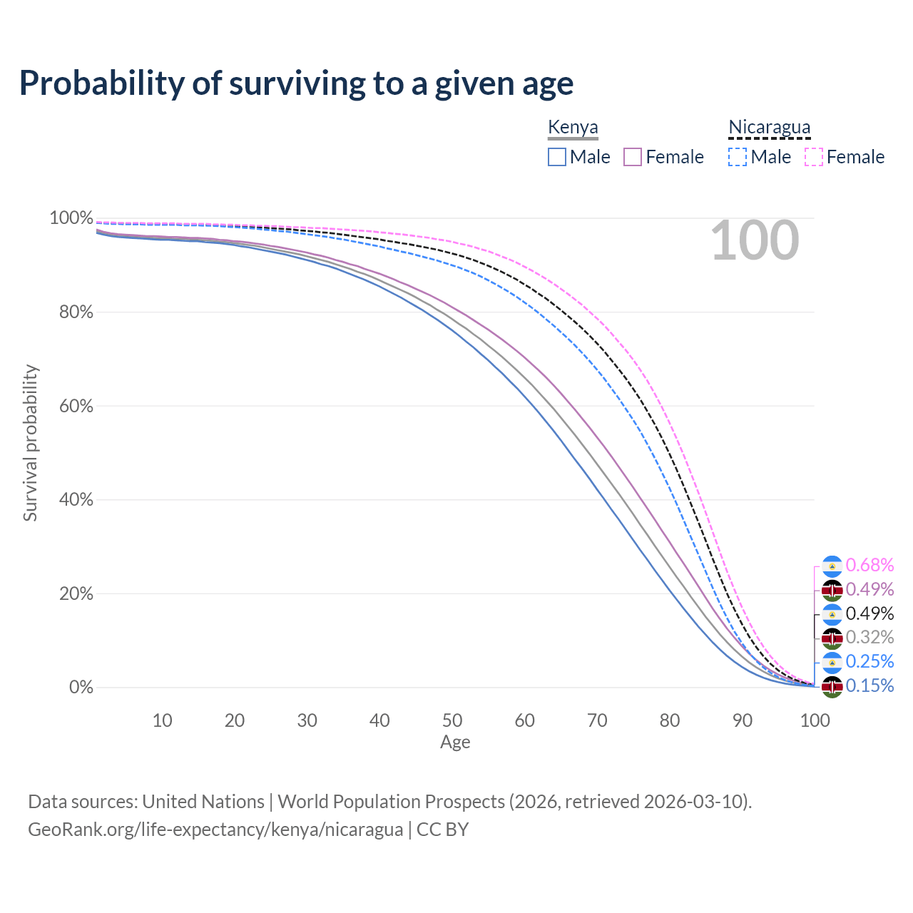 This life expectancy calculator shows the odds of living to 100, 95, 90, and below based on current age for both males and females in Kenya and Nicaragua, along with mean and median age of death. The calculations are based on the 2026 life tables (actuarial tables) from the UN World Population Prospects.